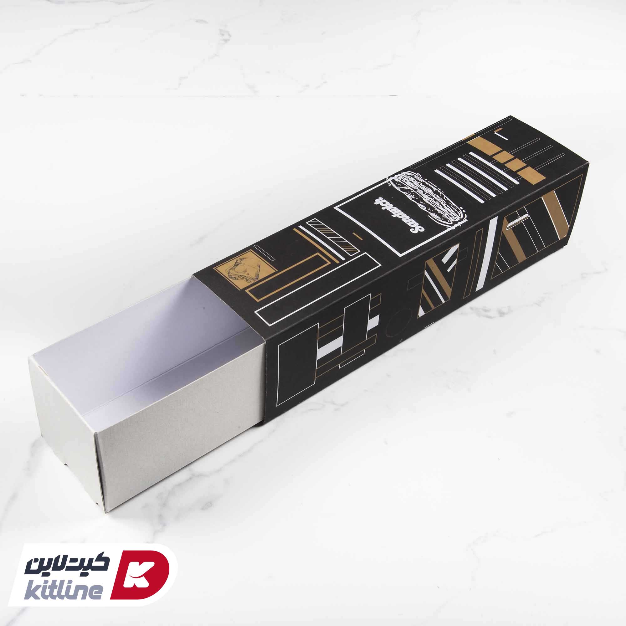 جعبه ساندویچ یکبار مصرف کاغذی کشویی طرح دار مشکی ۸×۳۲ سانتیمتری (کارتن ۲۰۰ عددی)