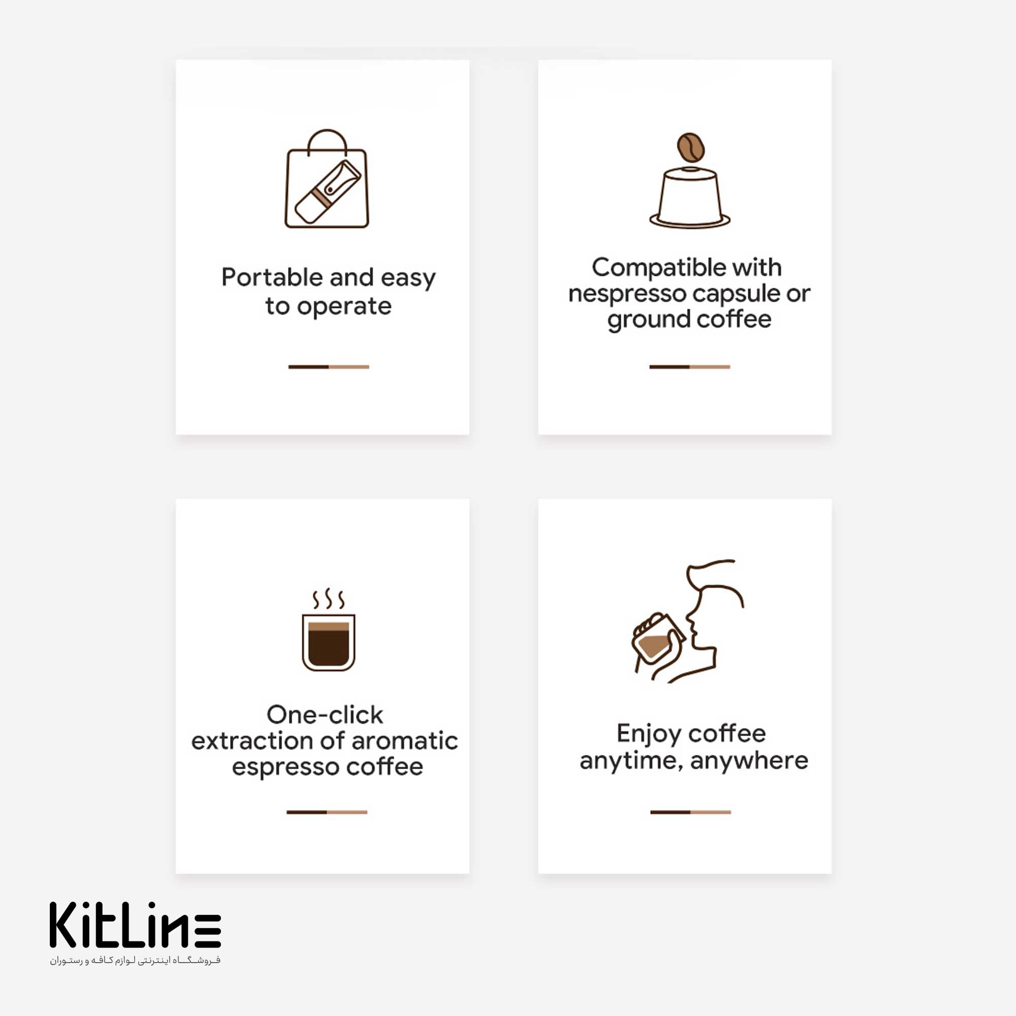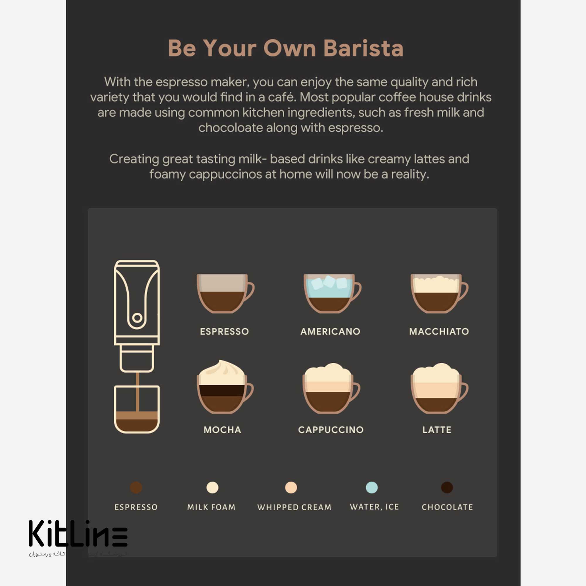 با دستگاه اسپرسو ساز مسافرتی (Travel Espresso Maker) میتوان انواع نوشیدنی ها برپایه قهوه از قبیل قهوه اسپرسو، کاپوچینو، موکا، امریکانو، ماکیاتو و لته را آماده و استفاده نمود.