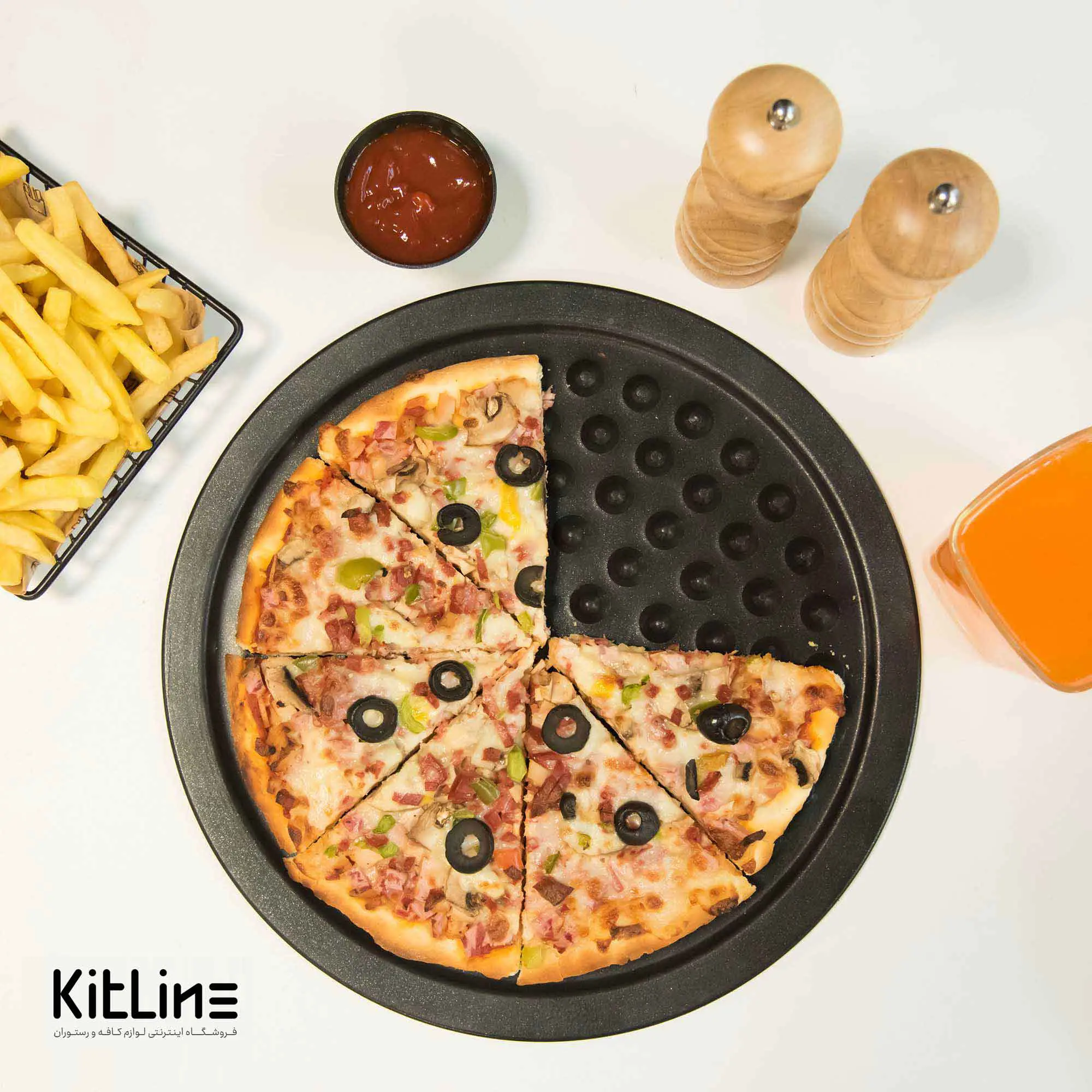 بشقاب تیله ای تفلون ۲۸ سانتیمتری کیچن تک، محصولی ایده‌آل برای سرو پیتزا در رستوران‌ها، کافه‌ها است.