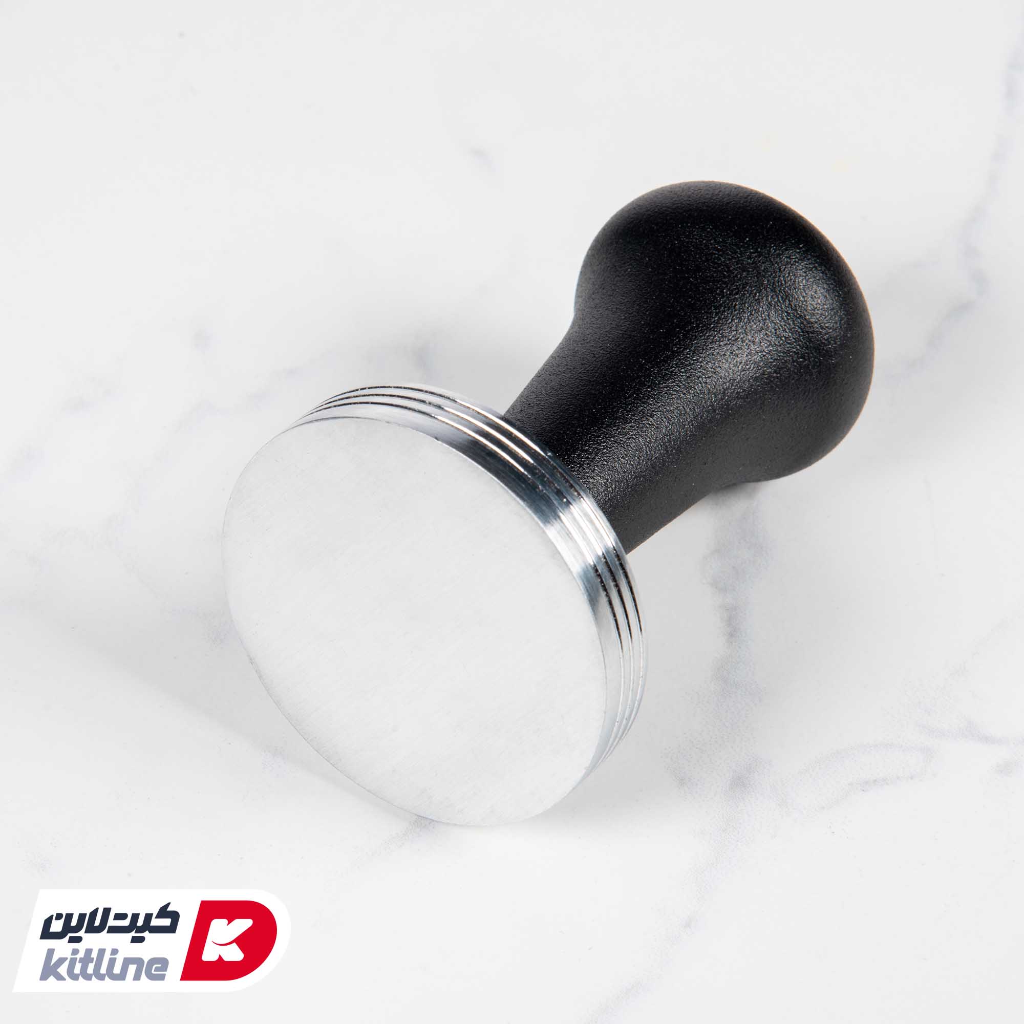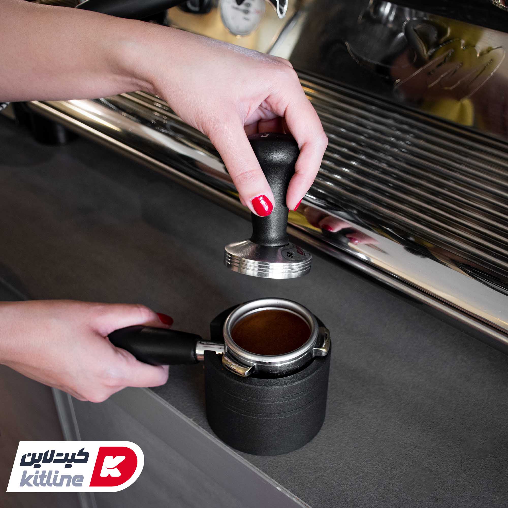 ۱- ابتدا تمپر را درون پورتافیلتر بگذارید و با سه انگشت شصت، وسط و اشاره آن را نگه دارید.