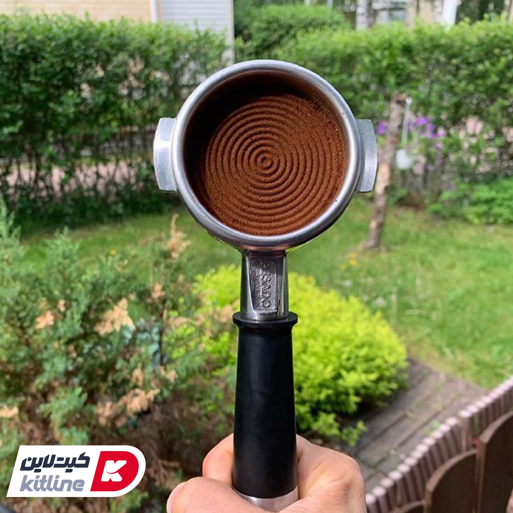 ۱- ابتدا تمپر را درون پورتافیلتر بگذارید و با سه انگشت شصت، وسط و اشاره آن را نگه دارید.