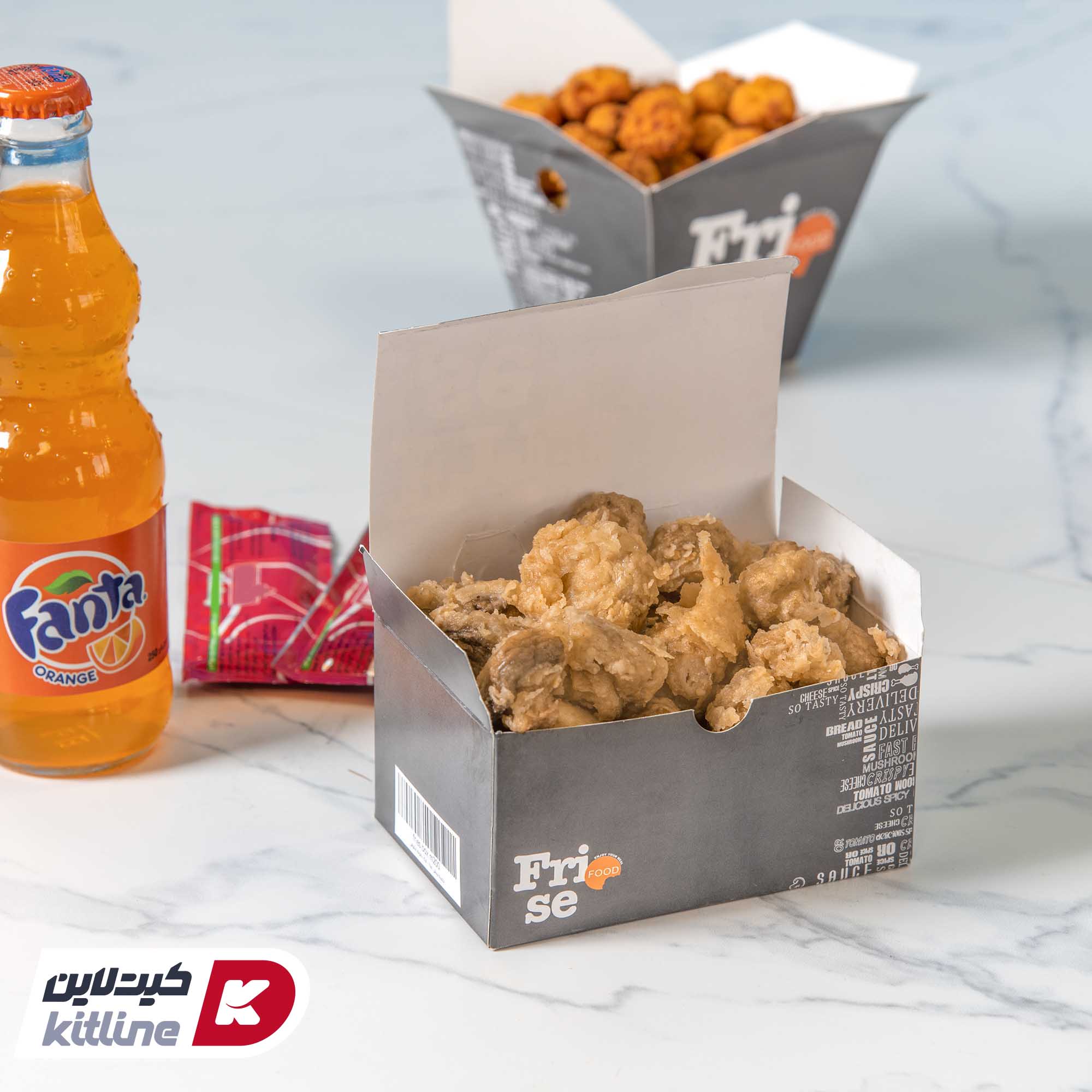 جعبه پیش غذا، محصولی مناسب برای سرو سیب زمینی سرخ کرده، قارچ سوخاری، پنیر سوخاری و دیگر مزه های کنار غذا در داخل سالن، دلیوری و سفارش بیرون بر میباشد.