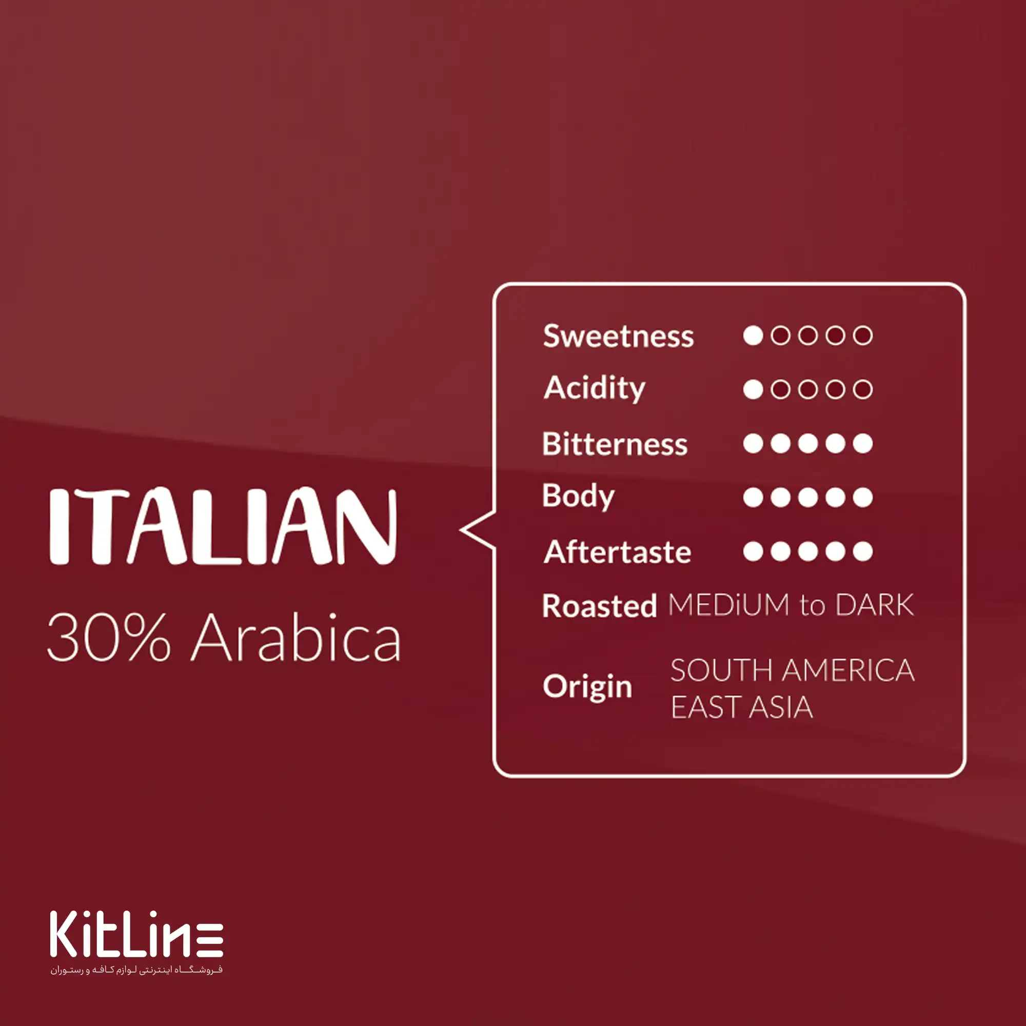 در دانه قهوه ترکیب ایتالین ۳۰٪ عربیکا تلاش‌ شده تا بهترین و ناب ترین نوع قهوه تازه رست شده در اختیار مشتریان قرار بگیرد.