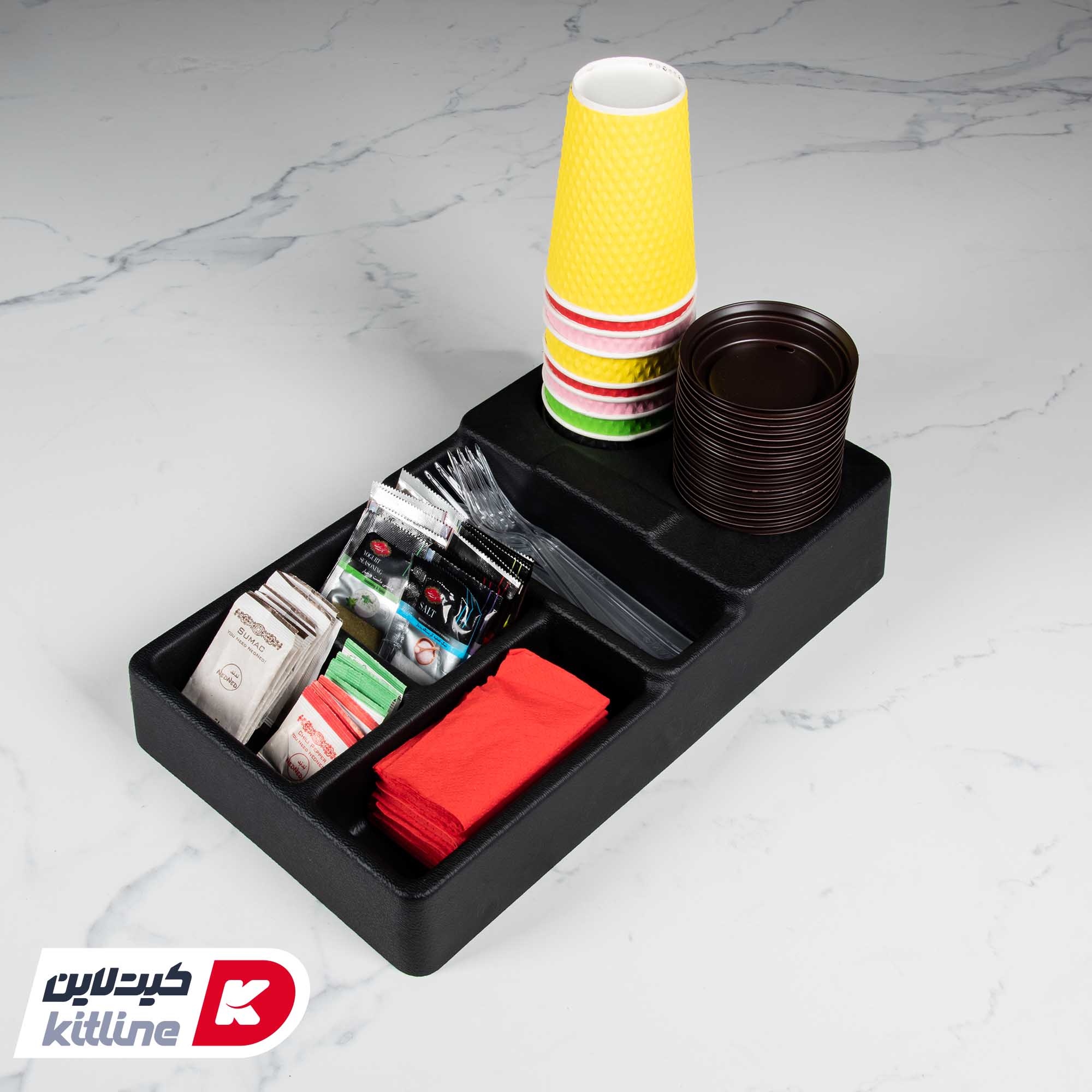 جای لیوان، دستمال، قاشق و چنگال و … وسیله ای پرکاربرد در بوفه ها و رستوران ها می باشد. می توان دستمال های تا شده را در یک سمت، لیوان های یکبار مصرف و درب لیوان ها را به صورت جداگانه در سمت دیگر، قاشق های یکبارمصرف یا ساشه های نمک و فلفل را در سایر محفظه های این دیسپنسر قرار داد. از دیسپنسر ۶ خانه می توان بر روی کانتر و یا میزهای سرو داخل سالن استفاده کرد. به خصوص در رستوران های سلف سرویس، فودکورت ها و یا فست فودهایی که فضای داخل سالن برای نشستن ندارند بسیار کاربردی است.