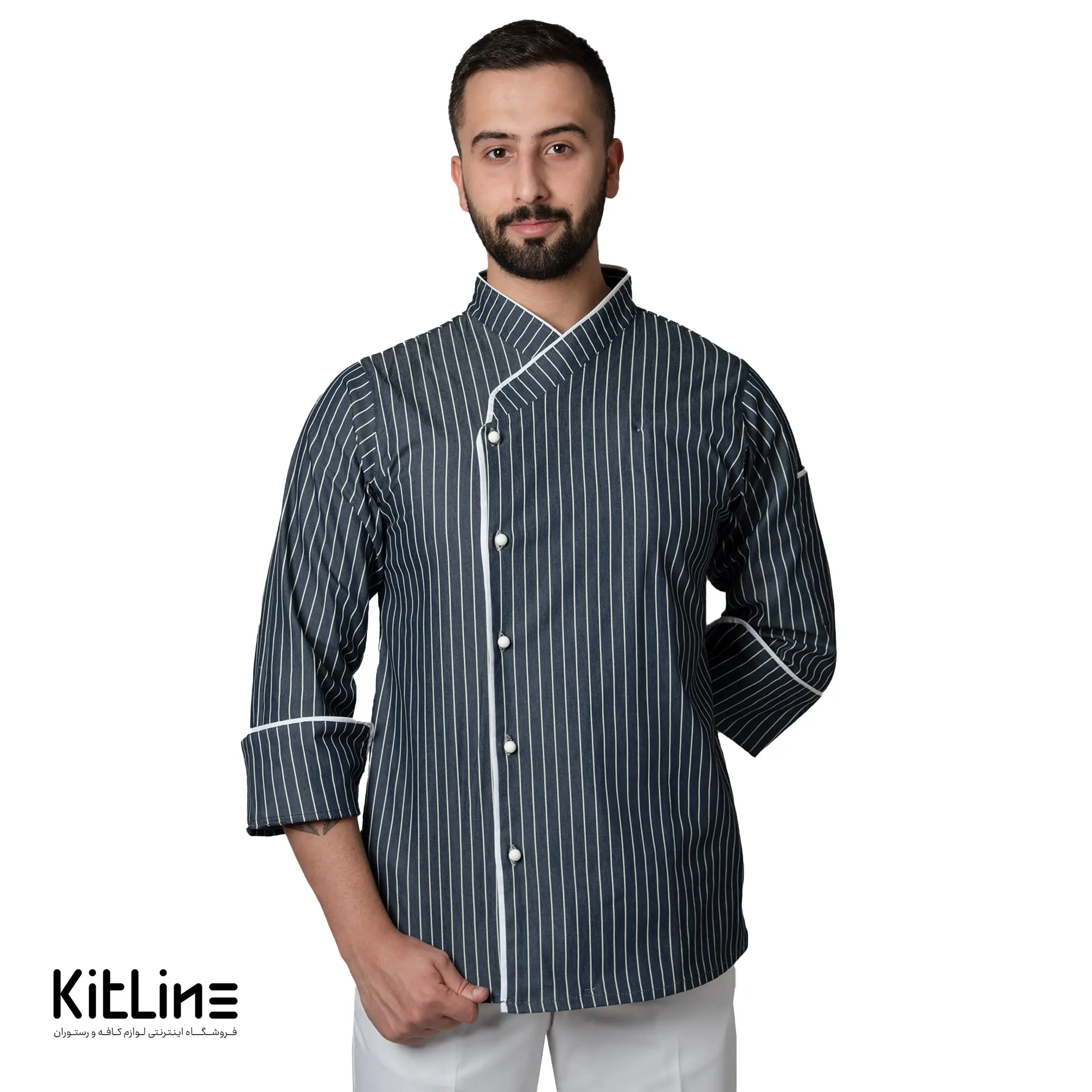 روپوش دکمه جداشو راه راه سرمه ای پوشاکو، ترکیبی از طراحی زیبا و کاربردی با کیفیت بالا است که برای سرآشپزها و کارکنان آشپزخانه در کافه‌ها، رستوران‌ها و هتل‌ها ایده‌آل است.