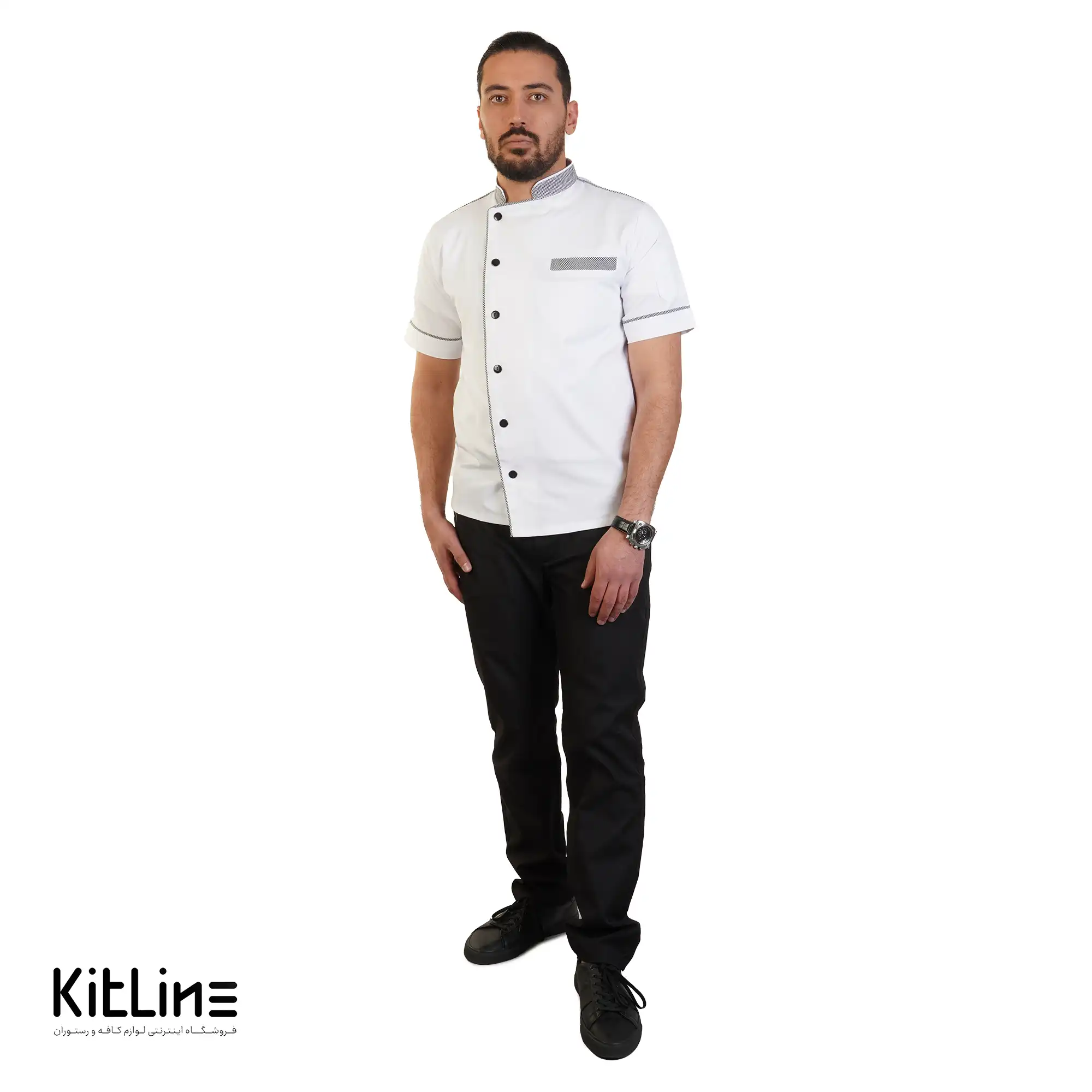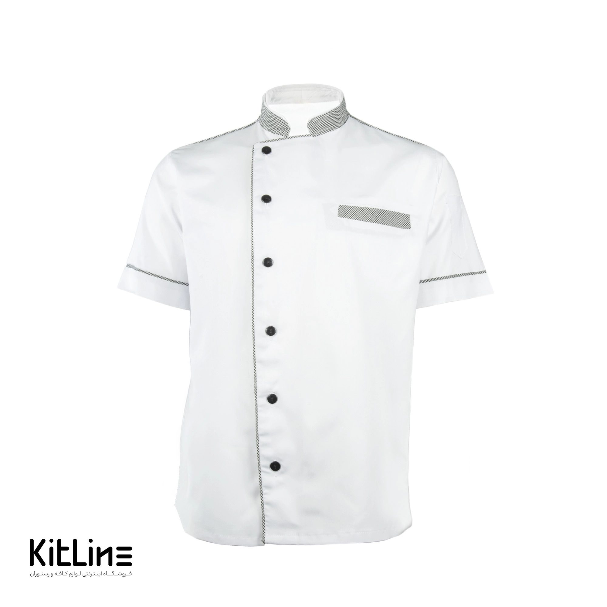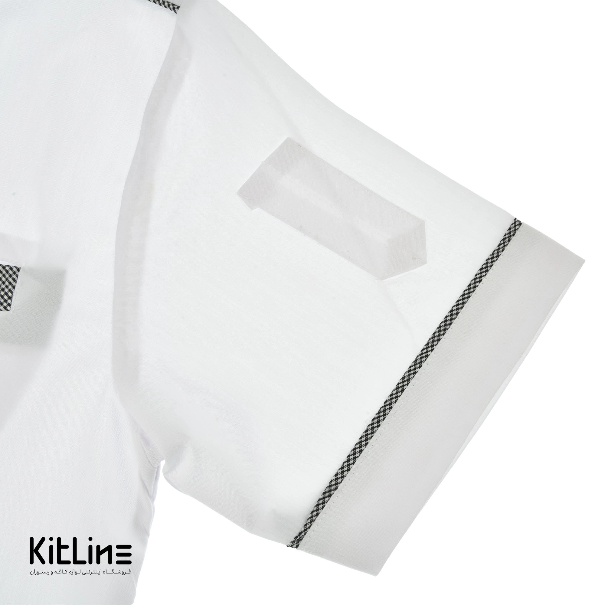 روپوش آستین کوتاه سفيد مغزی چهارخانه تک فرم مدل ويرا با طراحی زیبا و منحصر به فرد، یونیفورمی ایدهآل برای پرسنل آشپزخانه در رستورانها، هتلها، کافهها و سایر مکانهای غذاپزی است.