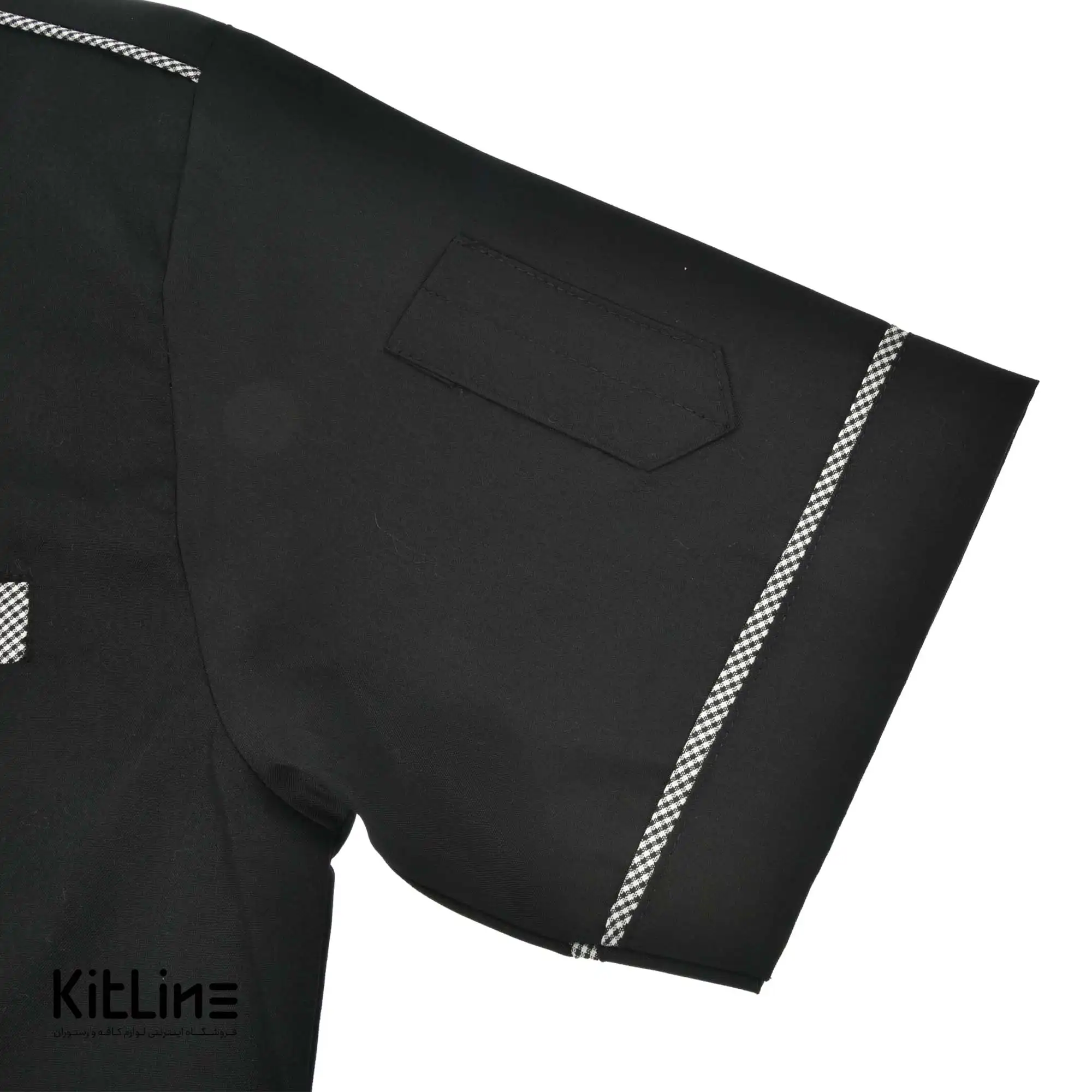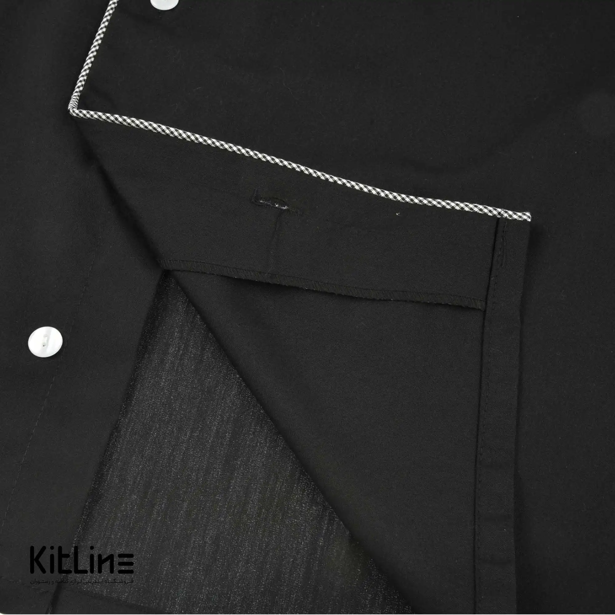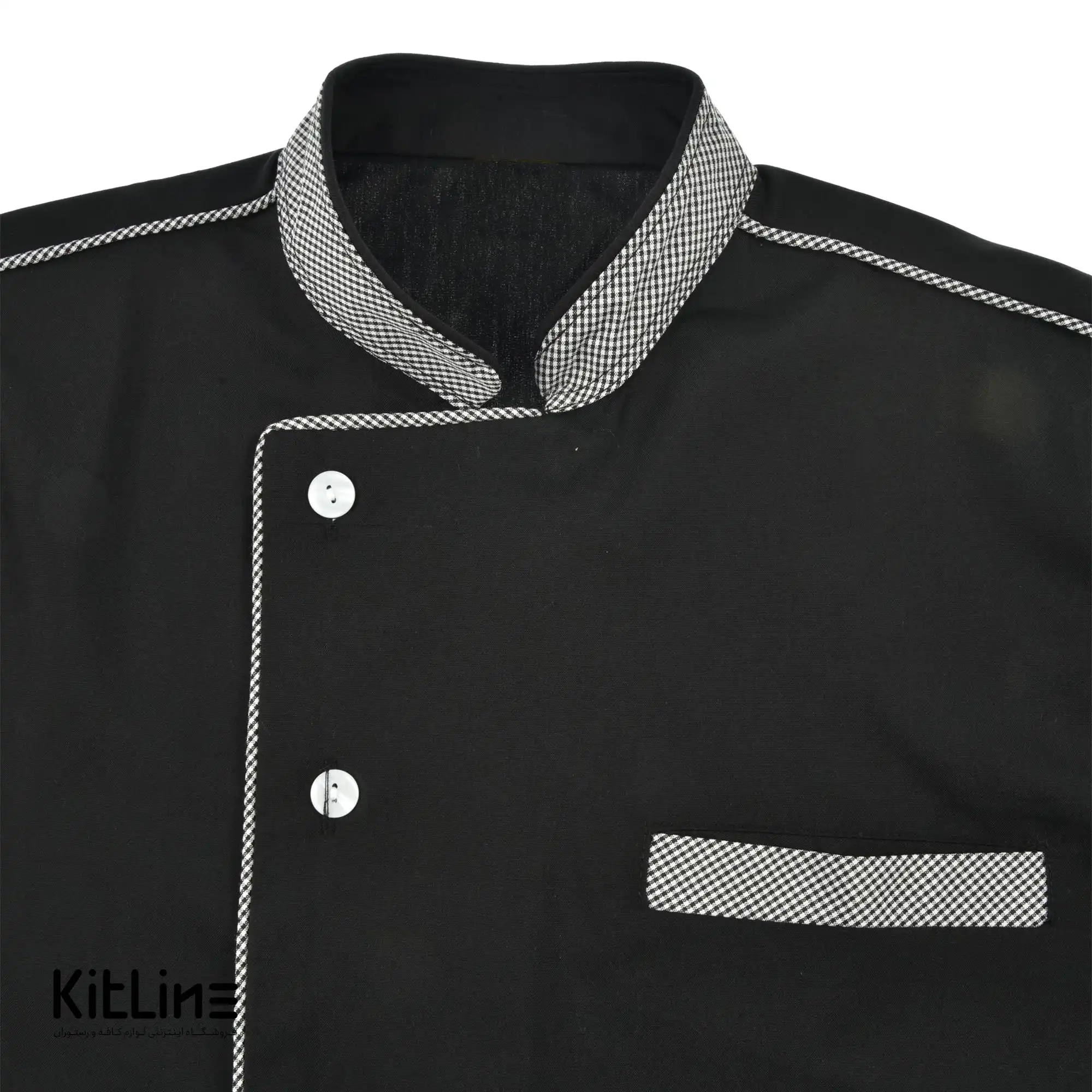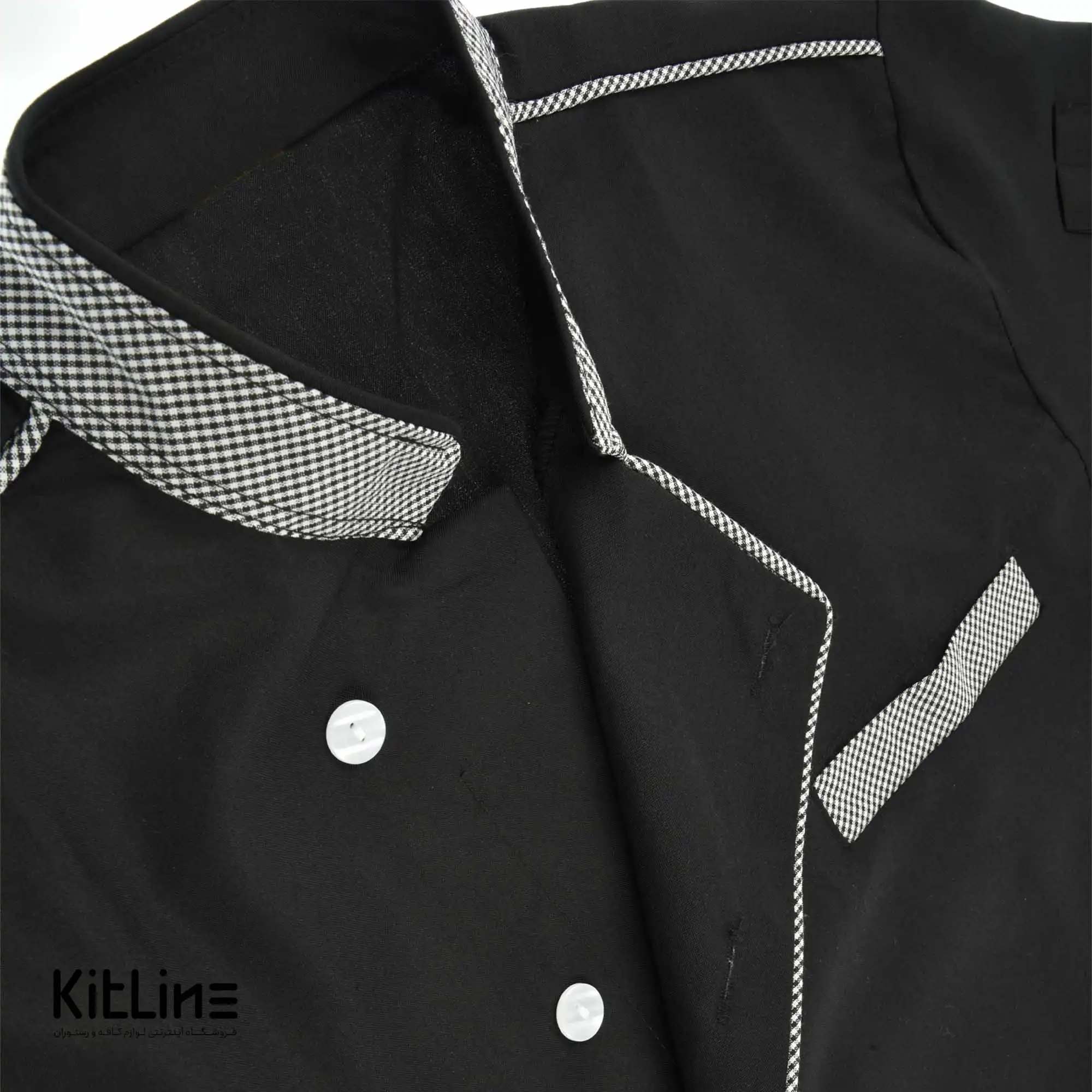 روپوش مشکی مغزی چهارخانه مدل ویرا با طراحی زیبا و منحصر به فرد، یونیفورمی ایدهآل برای پرسنل آشپزخانه در رستورانها، هتلها، کافهها و سایر مکانهای غذاپزی است.