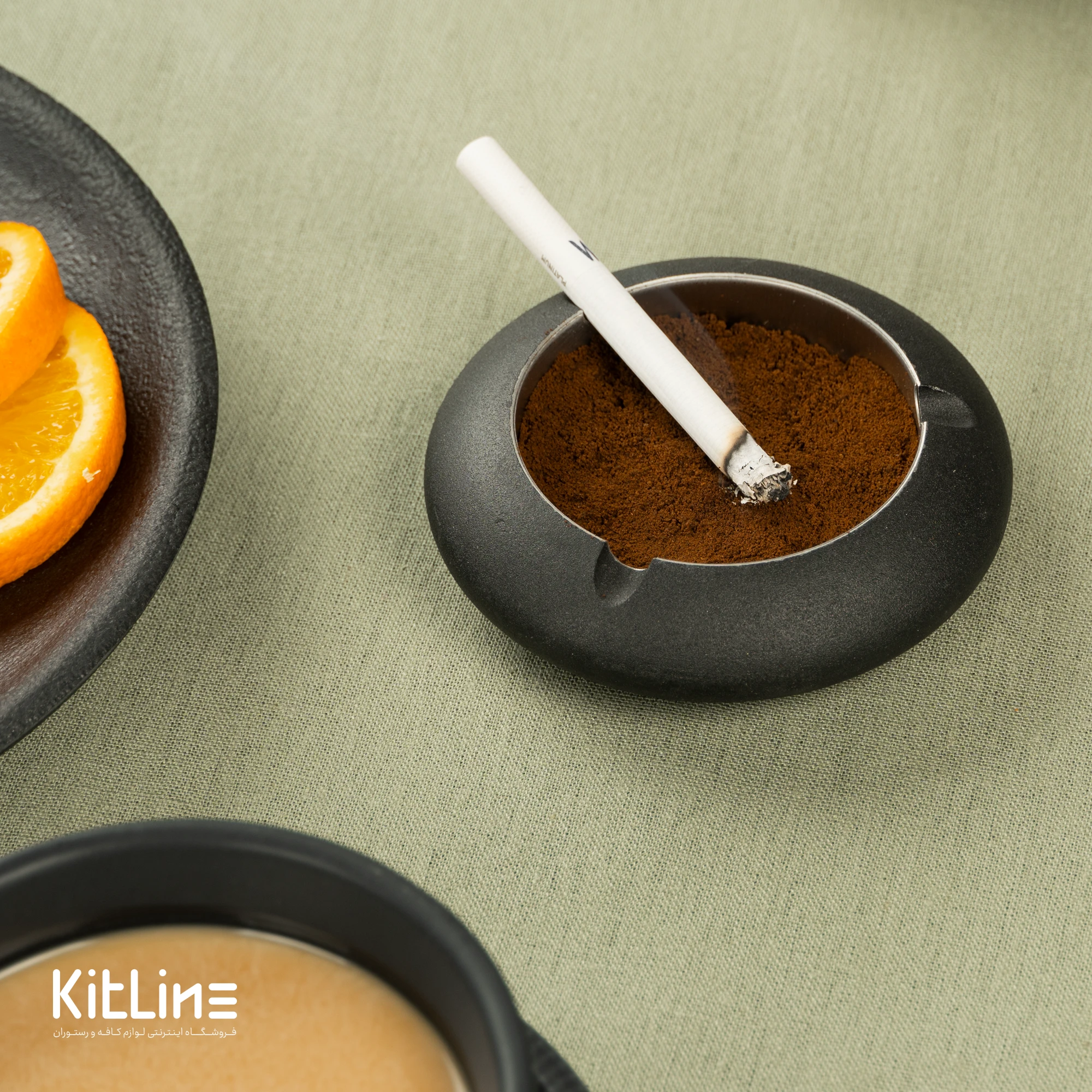 زیرسیگاری فلزی گرد با جای سیگار از ظروف سرو رومیزی است میتوان با ریختن مقداری قهوه داخل زیرسیگاری از پخش شدن بوی نامطبوع سیگار جلوگیری کرد. همچنین برای افرادی که سر میز هستند لذت بخشتر خواهد بود زیرا پس از خاموش کردن سیگار بوی آن نخواهد ماند.