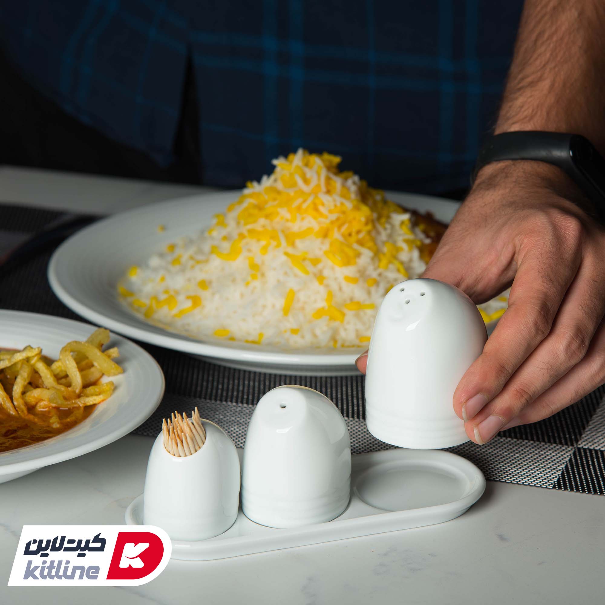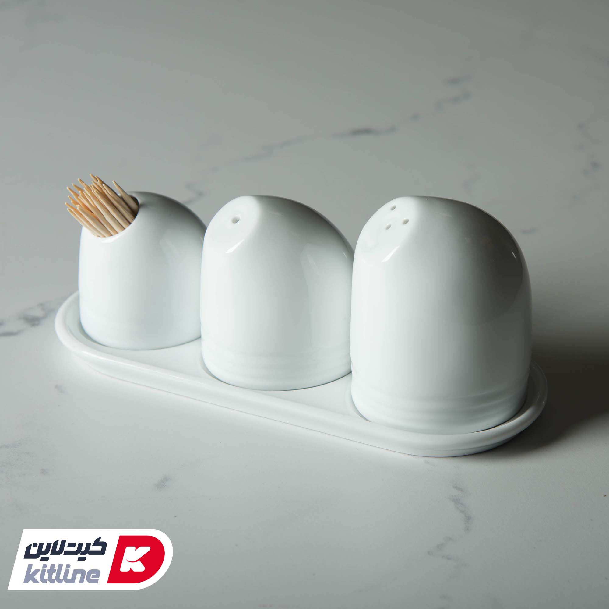 سرویس نمک پاش، فلفل پاش، جا خلالی و سینی چینی هتلی زرین