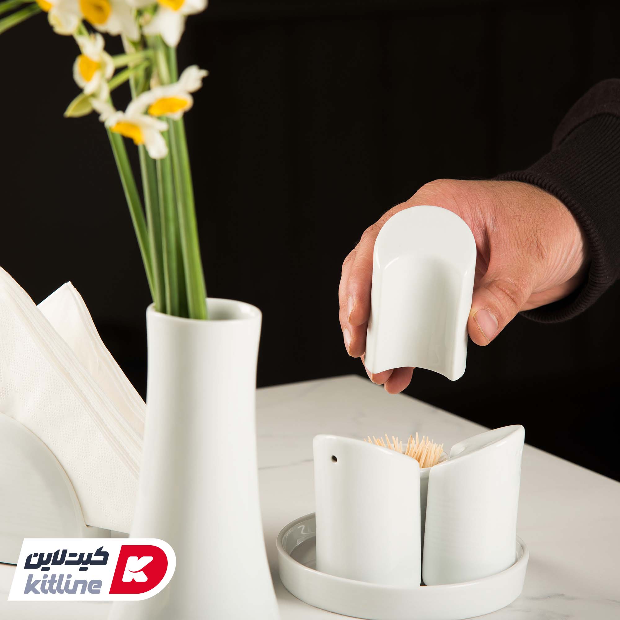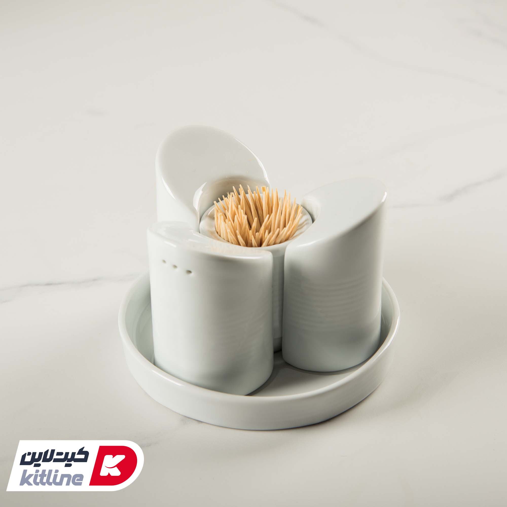 سرویس نمک پاش، فلفل پاش، سماق پاش، جا خلالی و سینی چینی هتلی زرین