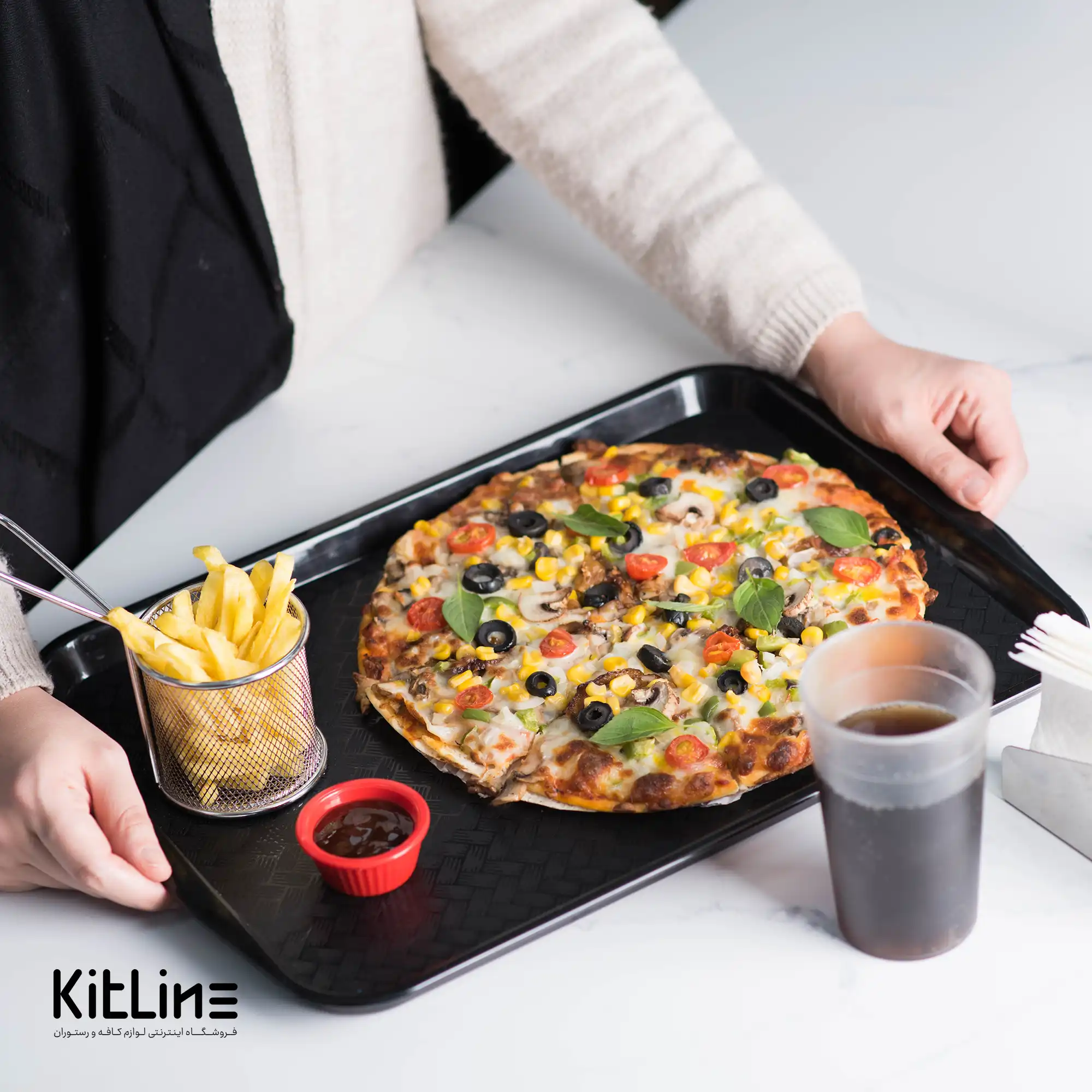 - کاربرد متنوع:میتوانید انواع جعبه برگر، جعبه سوخاری، لیوان، سالاد، کارد و چنگال و … را برای سرو داخل سینی قرار دهید و یا پیتزا را به همراه سینگل در سینی سرو کنید.