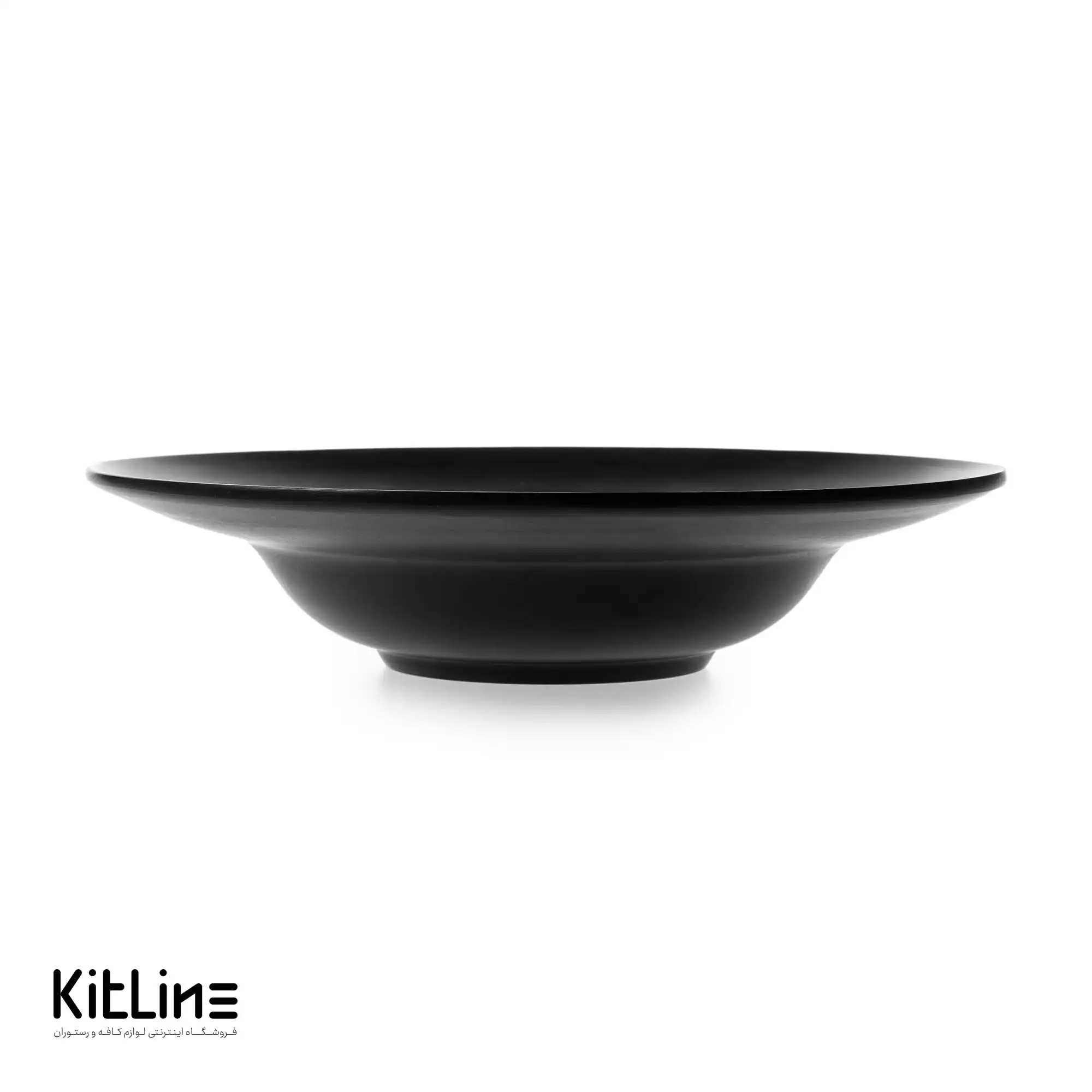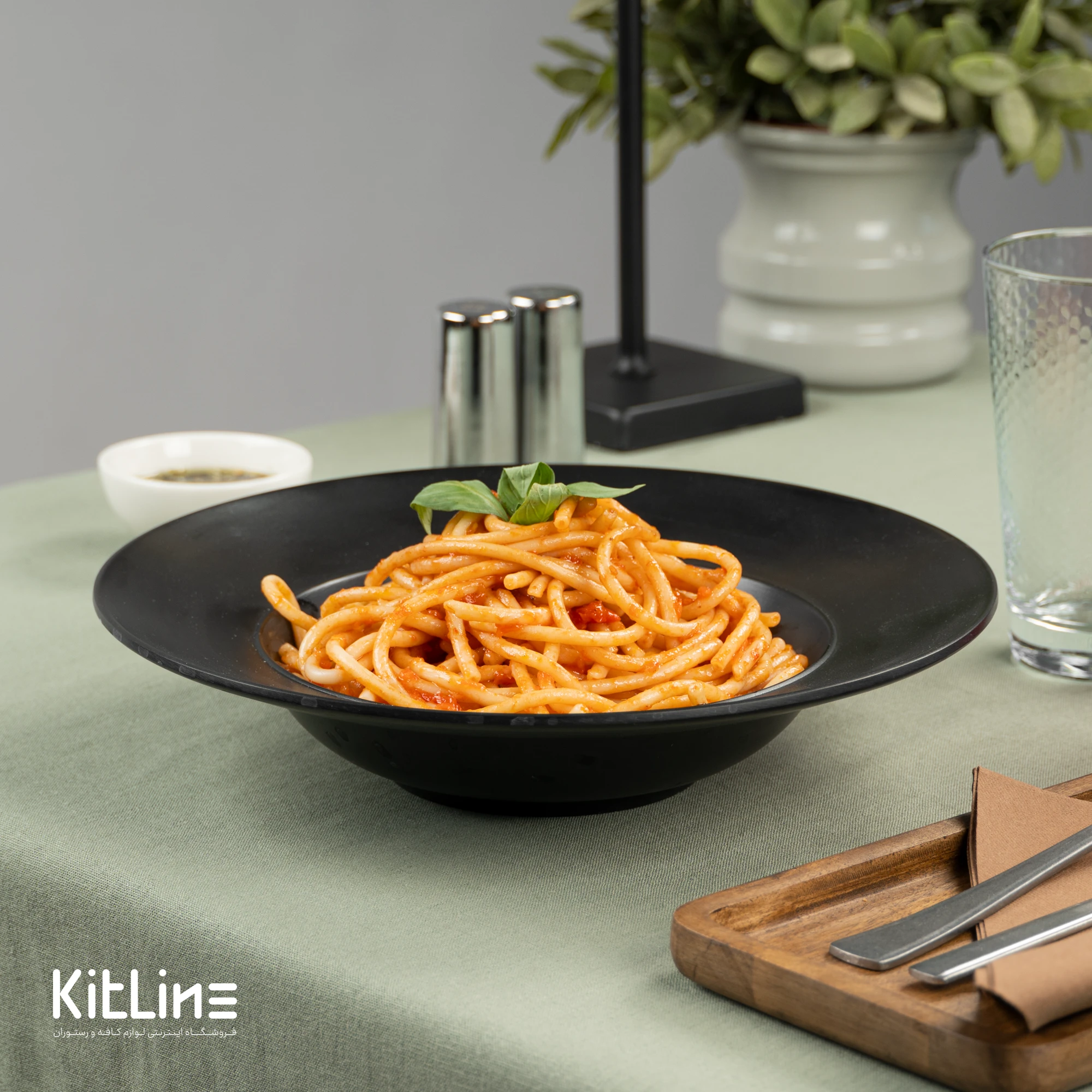 ظرف پاستا خوری ملامین ۲۷ سانتیمتری مشکی با طراحی زیبا و مدرن، یک انتخاب ایدهآل و جذاب برای استفاده در رستورانها، کافهها، فست فودها، هتلها و سایر مکانهای سرو غذا است.