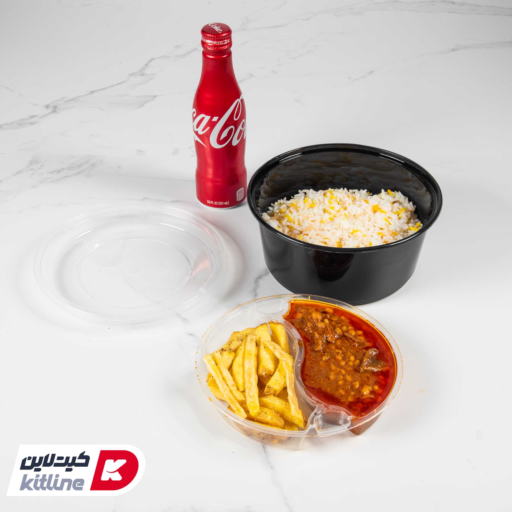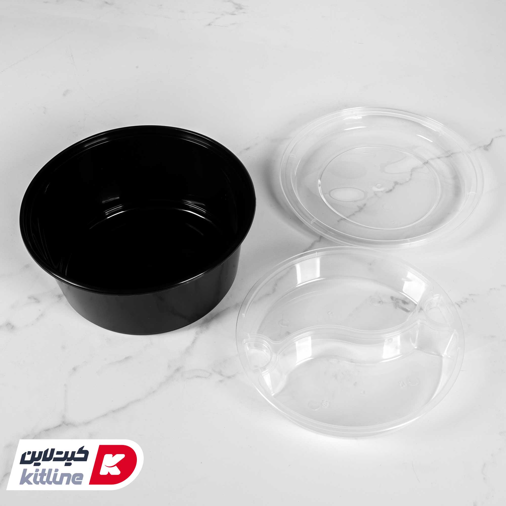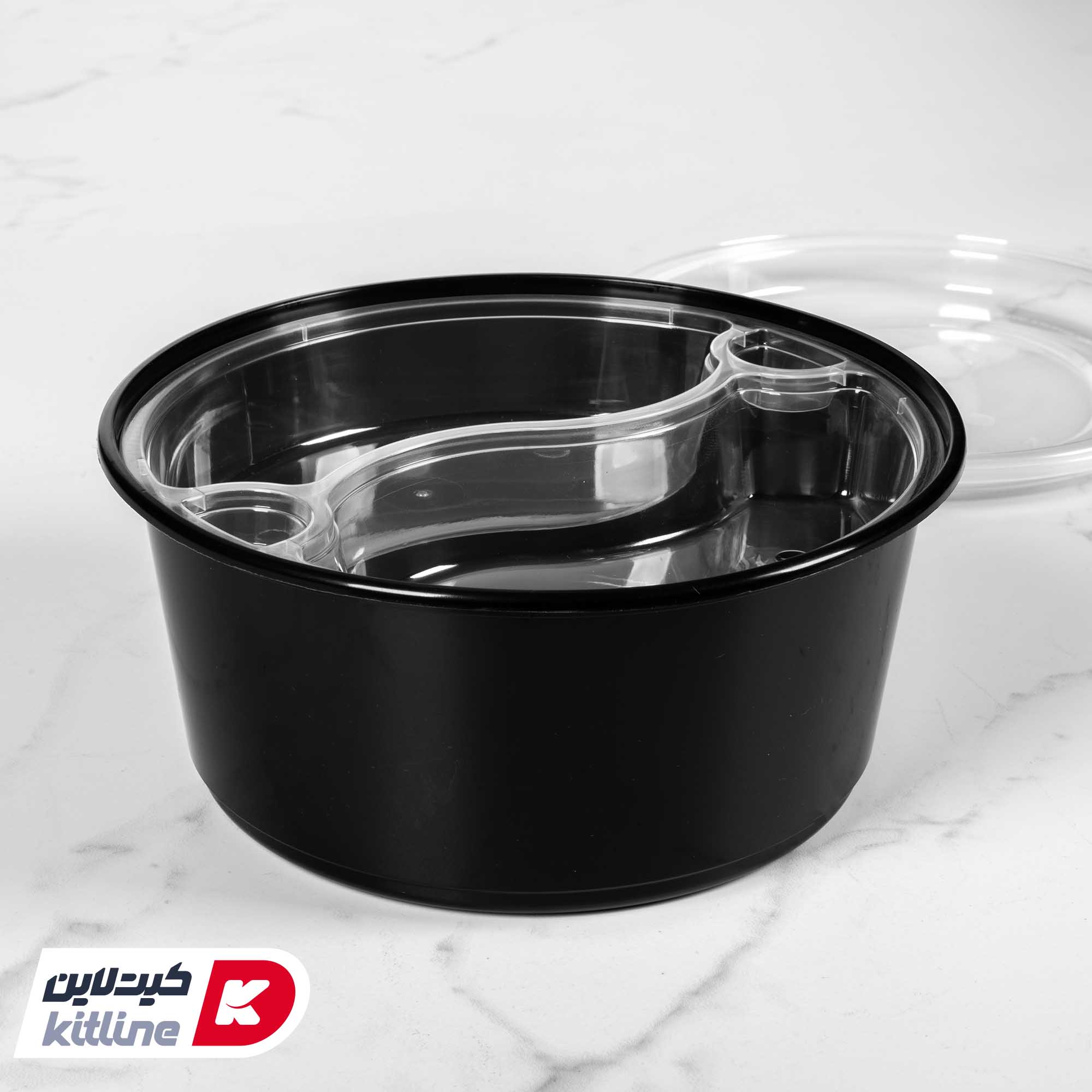 ظرف یکبار مصرف ۱۵۰۰ml مشکی هات دلیوری به همراه دیوایدر را میتوان بدون درب داخل مایکروویو قرار داد.