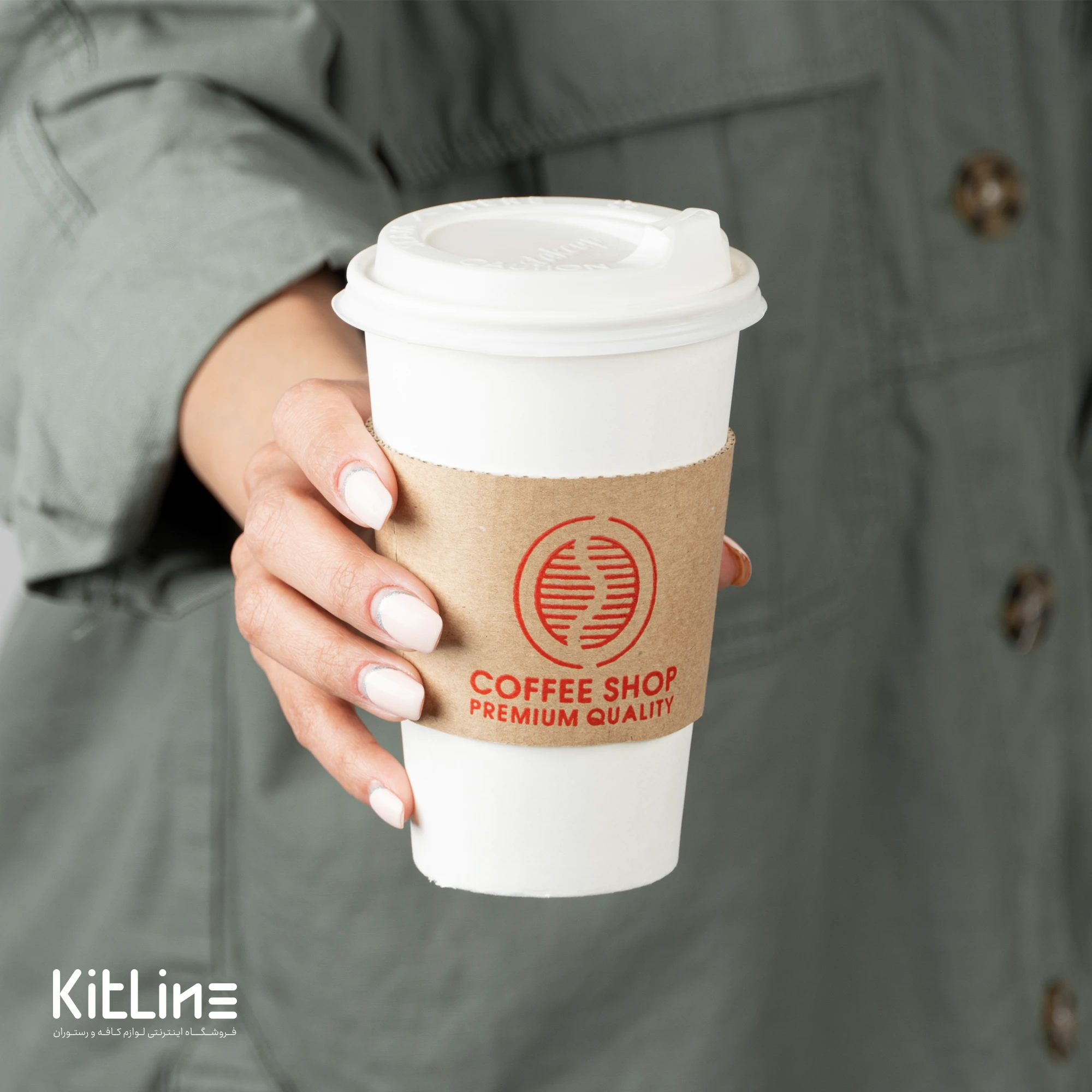 ليوان کاغذی تک جداره سفيد ۴۸۰ml همراه با درب سفيد و اسليو: