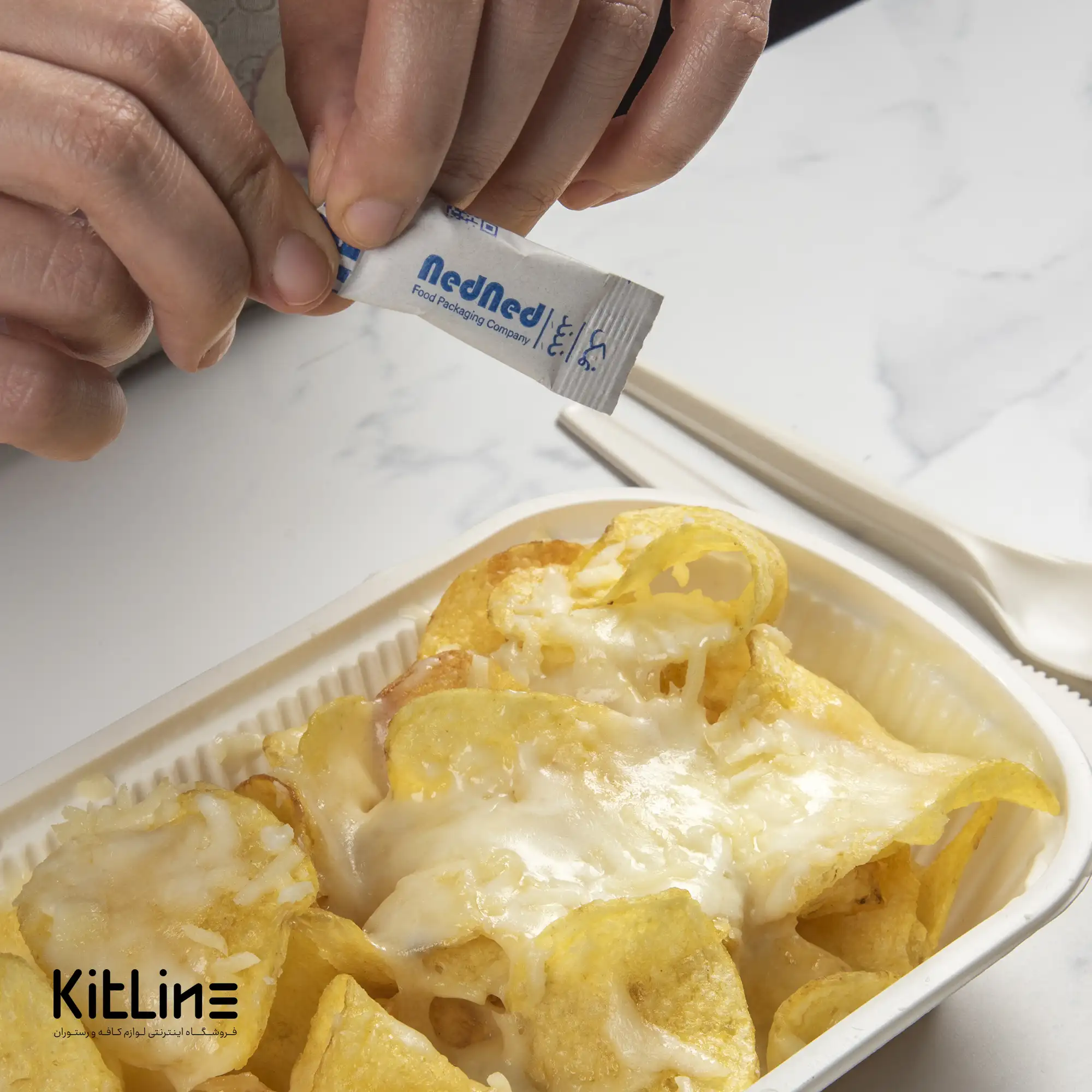 بسته بندی نمک تک نفره ندند کاغذی با روکش داخلی پلاستیکی است. این کیفیت نمک را به خوبی حفظ میکند و حمل و نقل آن را ساده میکند.