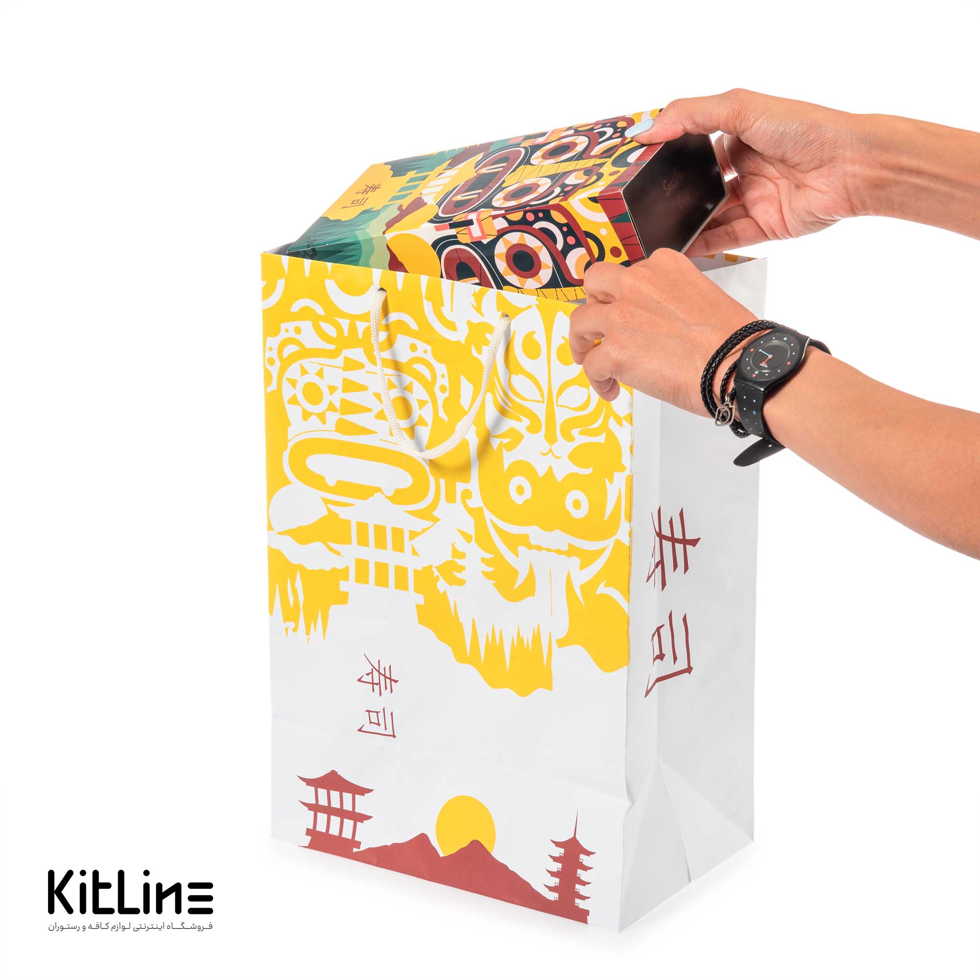 پاکت دليوری سوشی بند دار کاغذی مناسب برای رستوران‌ها، کافه‌ها، فست فودی‌ها جهت ارسال سفارش های بیرون بر و دلیوری سوشی می‌باشد.