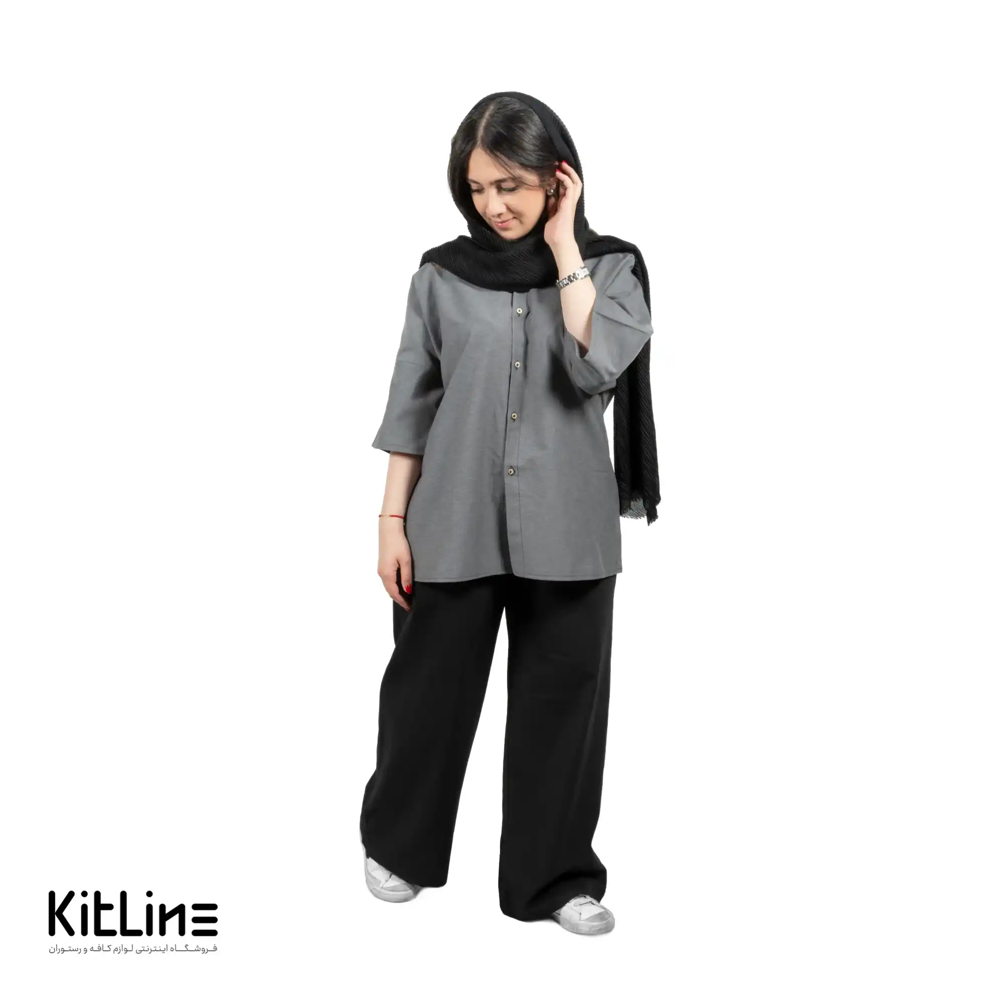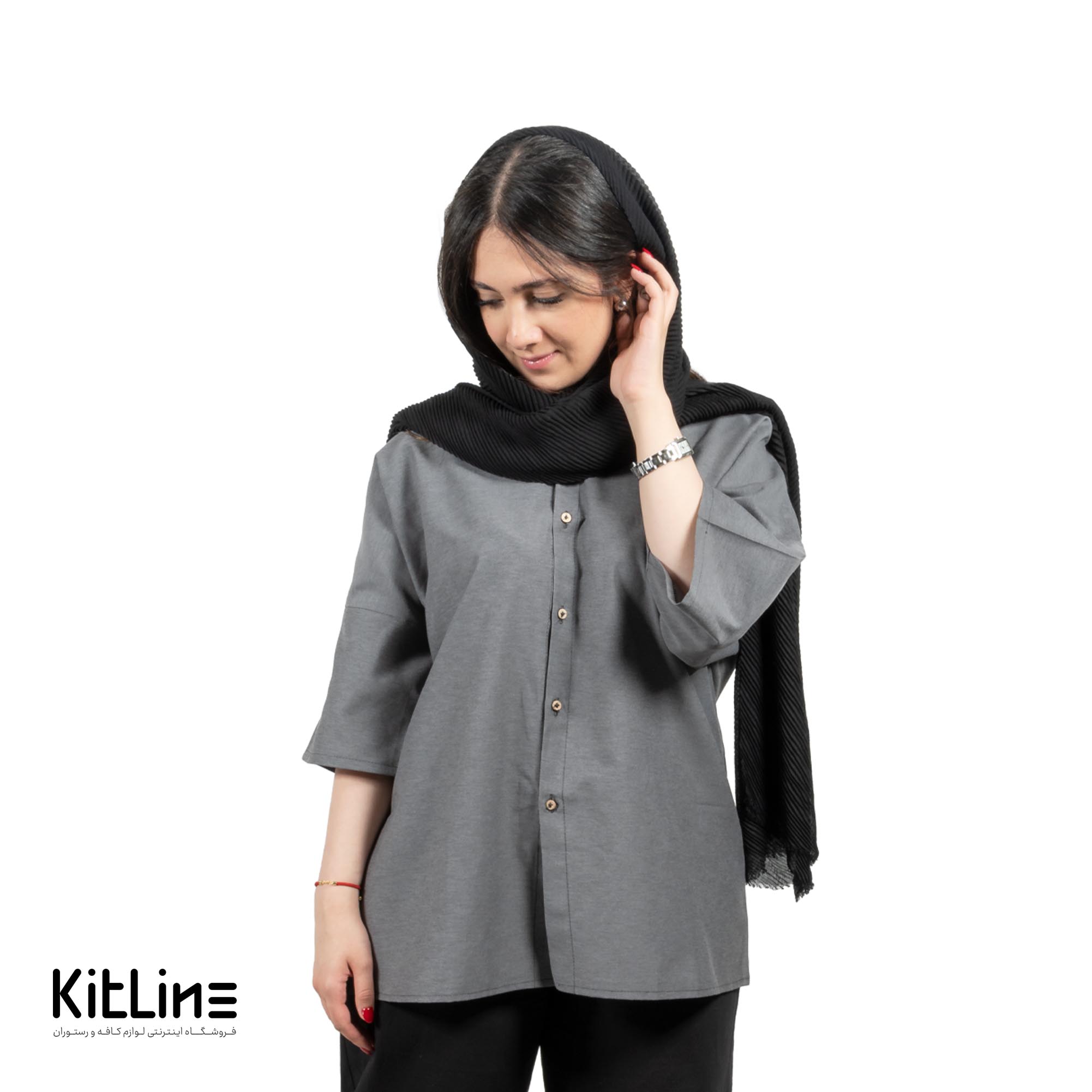 پیراهن لینن طوسی تیره، با طراحی شیک و جنس با کیفیت، راحتی و خنکی بی‌نظیری را برای کارکنان سالن و ویترها فراهم می‌کند.