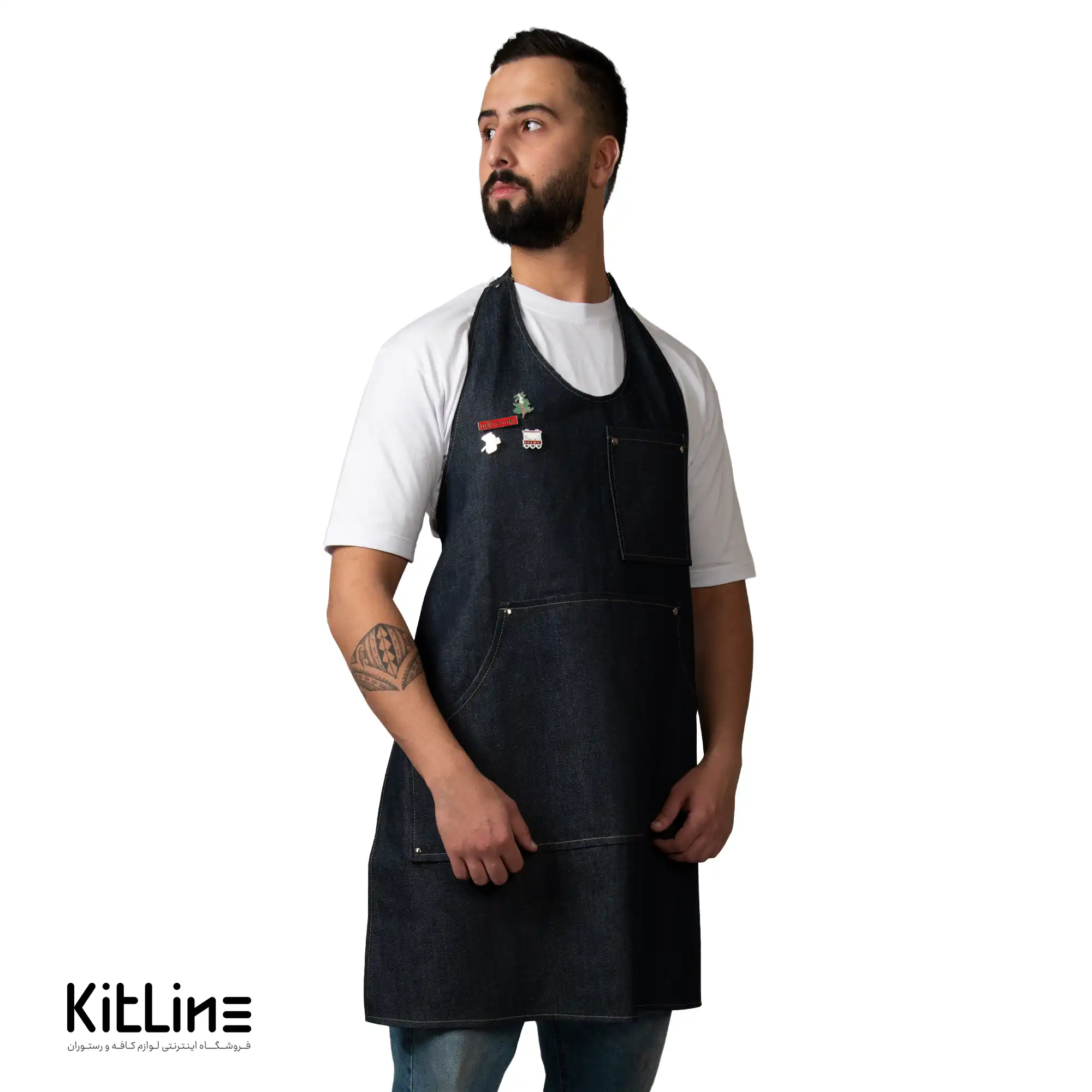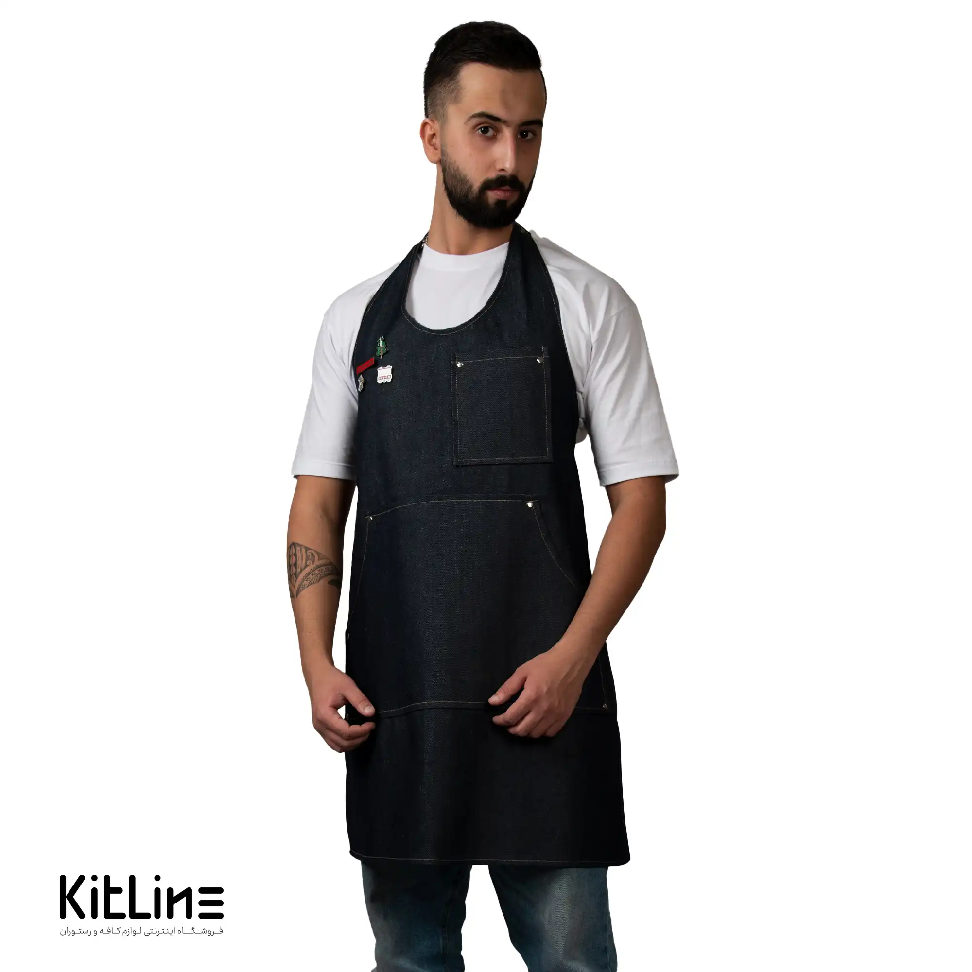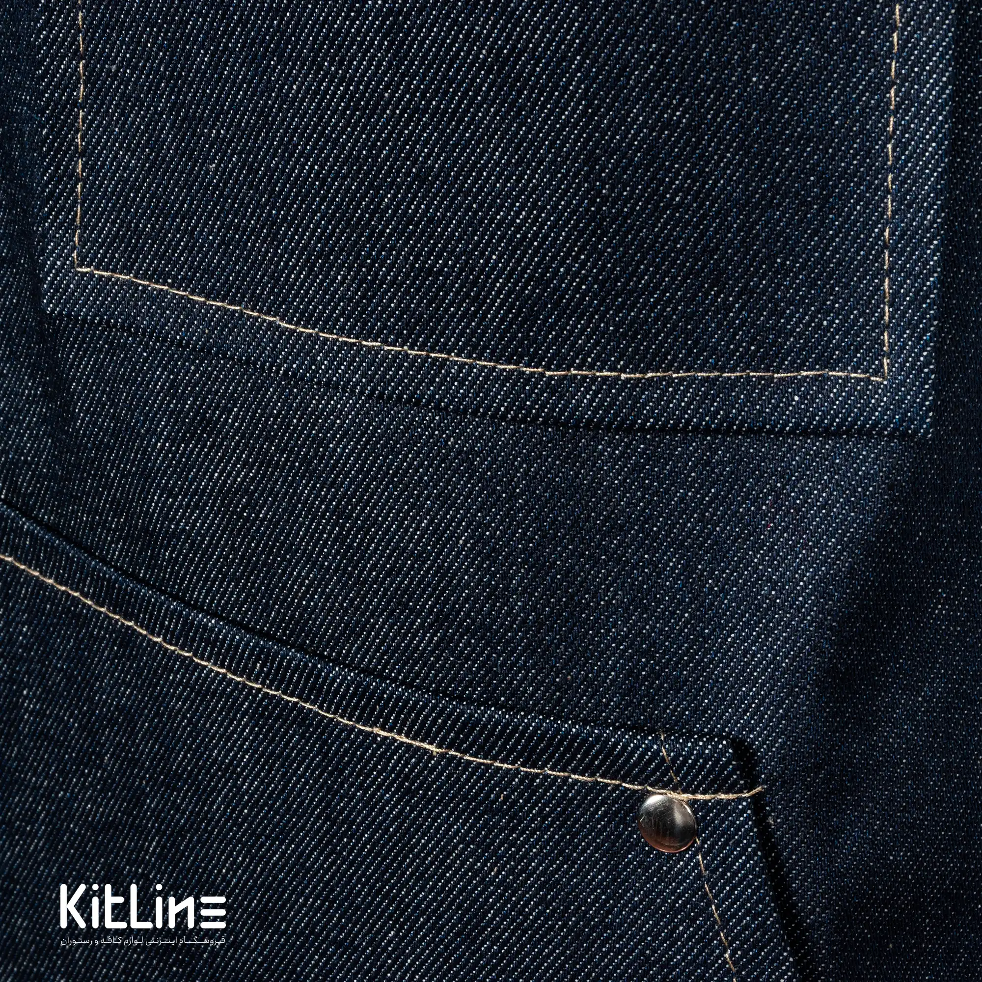 - رنگ جین تیره: رنگ جین تیره این پیشبند به شما ظاهری شیک و حرفهای میبخشد و کثیفی را کمتر نشان میدهد.