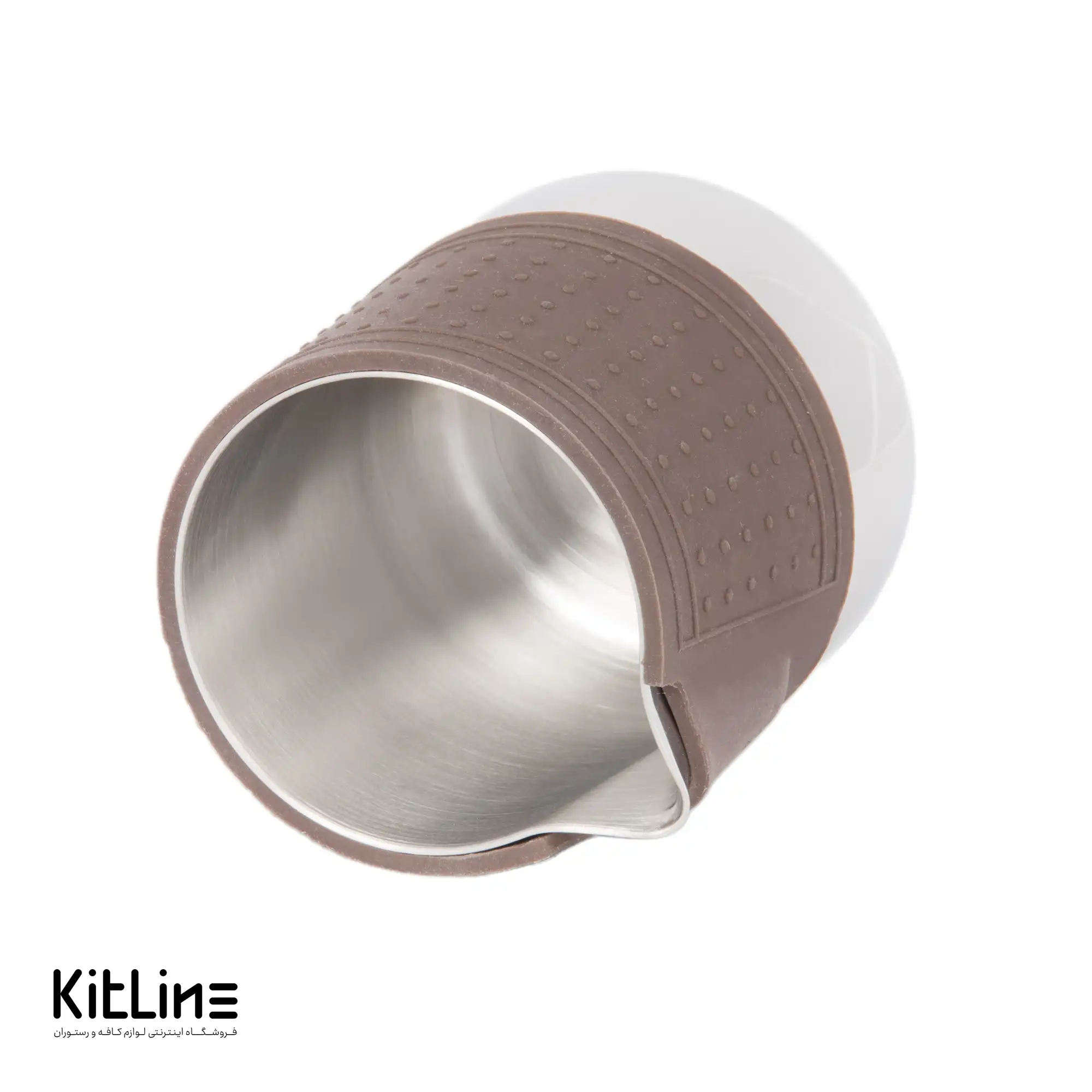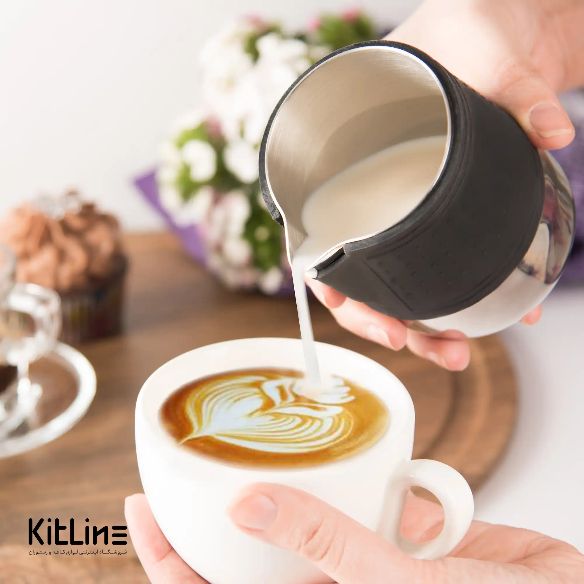 - فومگیری شیر: پیچر را تا نیمه از شیر پر کنید. نازل بخار دستگاه اسپرسو را درون شیر قرار دهید و بخار را فعال کنید. با کمک روکش سیلیکونی و عدم وجود دسته، میتوانید پیچر را بهطور کامل در دست بگیرید و کنترل بهتری بر فرآیند فومگیری داشته باشید.
