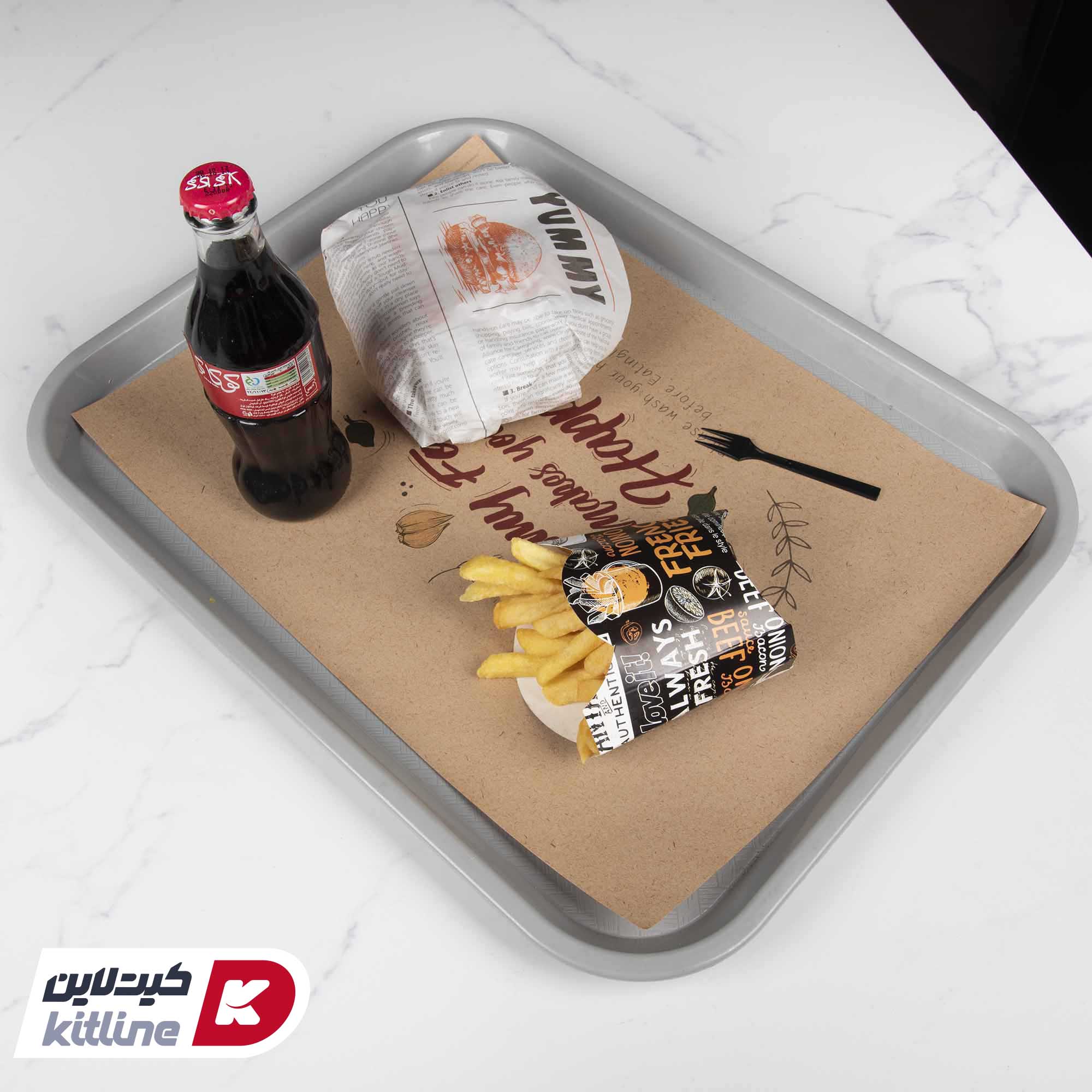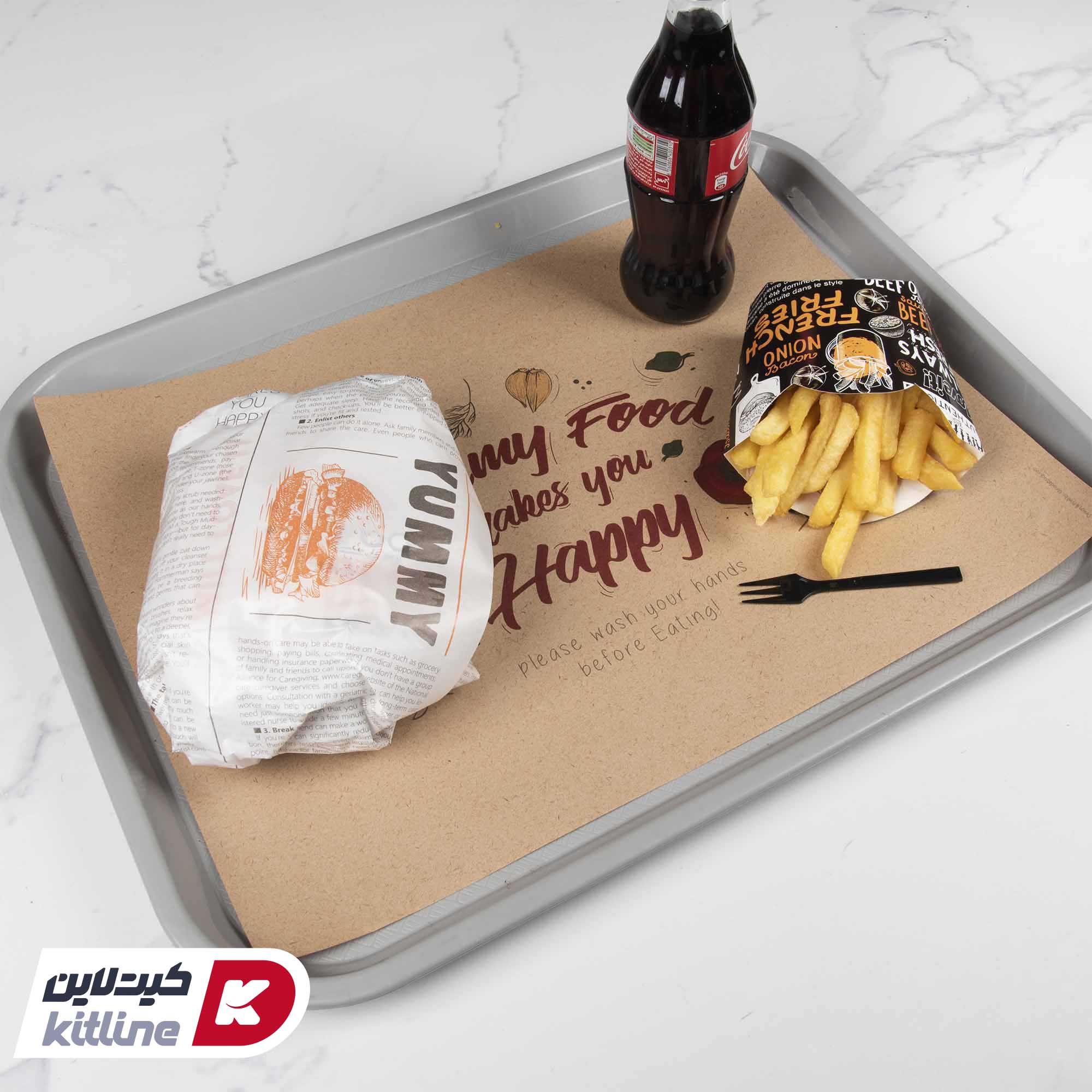 در صنعت فست فود بسته بندی از چند جهت حائز اهمیت است. اولا بسته بندیها باید بتواند به سادهترین شکل معرف نوع خوراک باشد و ثانیا بتواند از لحاظ بهداشتی محافظ مناسبی در برابر آلودگی های محیطی باشد. از طرفی می توان با طراحی مناسب بسته بندیها از قبیل کاورهای ساندویچ، بستههای سیب زمینی و کنتاکی یا کاغذهای کف سینی تاثیر تبلیغاتی مناسبی در ذهن مخاطب برجای گذاشت. از کاغذ کف سینی ۳۰×۴۰ سانتیمتر کرافت هپی میتوان روی سینیهای فست فود برای سرو داخل سالن استفاده کرد تا هر بار پس از استفاده مشتری با تعویض کاغذ از انتشار آلودگی جلوگیری کرد. وزن هر کارتن حاوی کاغذ کف سینی در حدود ۵ کیلوگرم می باشد.