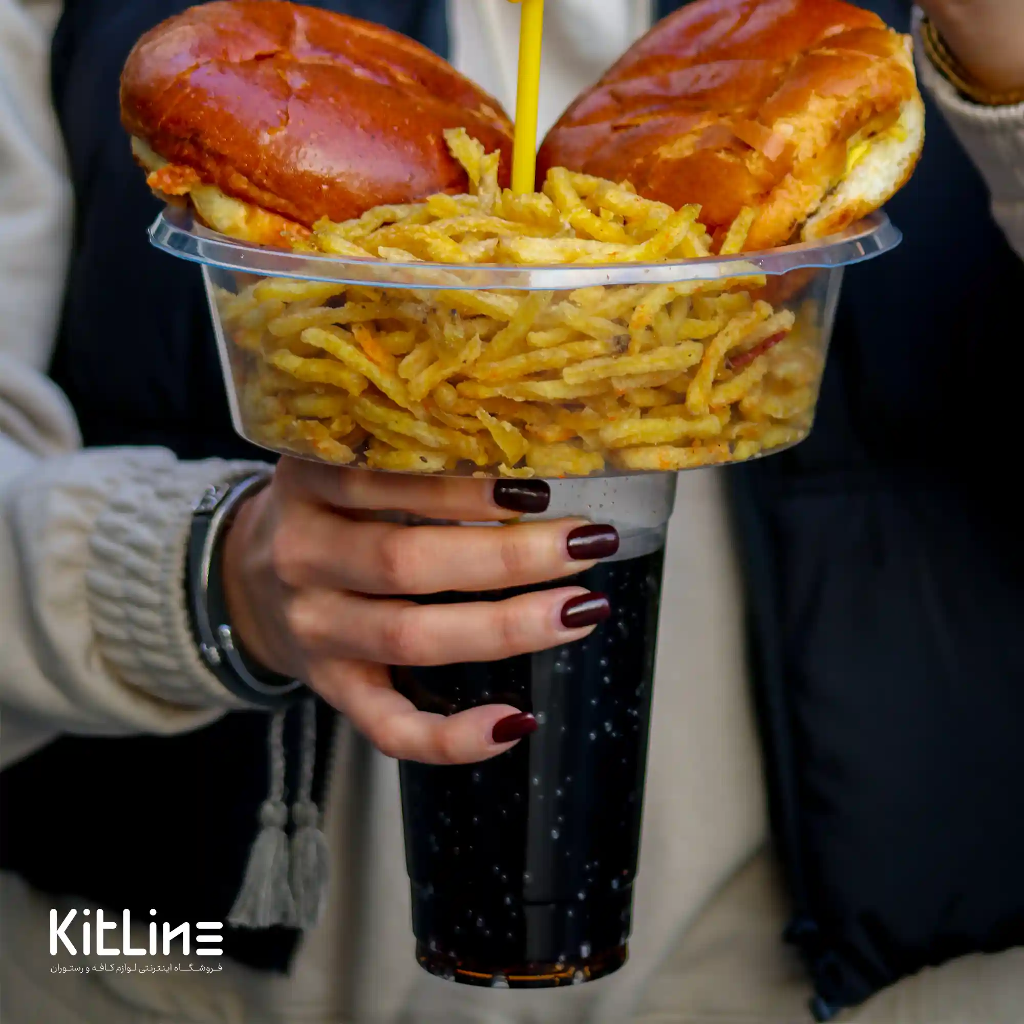 کاپ اند بول شفاف فست فودی، یک انتخاب ایده‌آل برای سرو و حمل همزمان خوراکی‌ها و نوشیدنی‌ها است. این محصول با طراحی کاربردی خود به ویژه برای رستوران‌ها، کافه‌ها و فودتراک‌ها مناسب می‌باشد و تجربه‌ای راحت و بهینه را برای مشتریان فراهم می‌آورد.